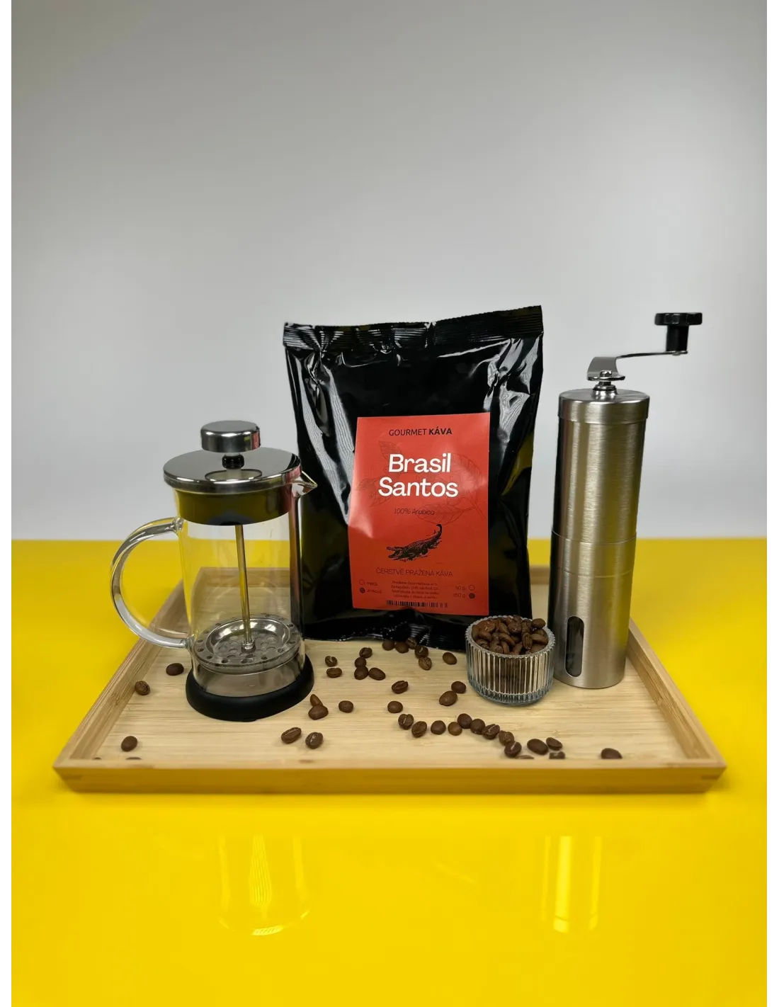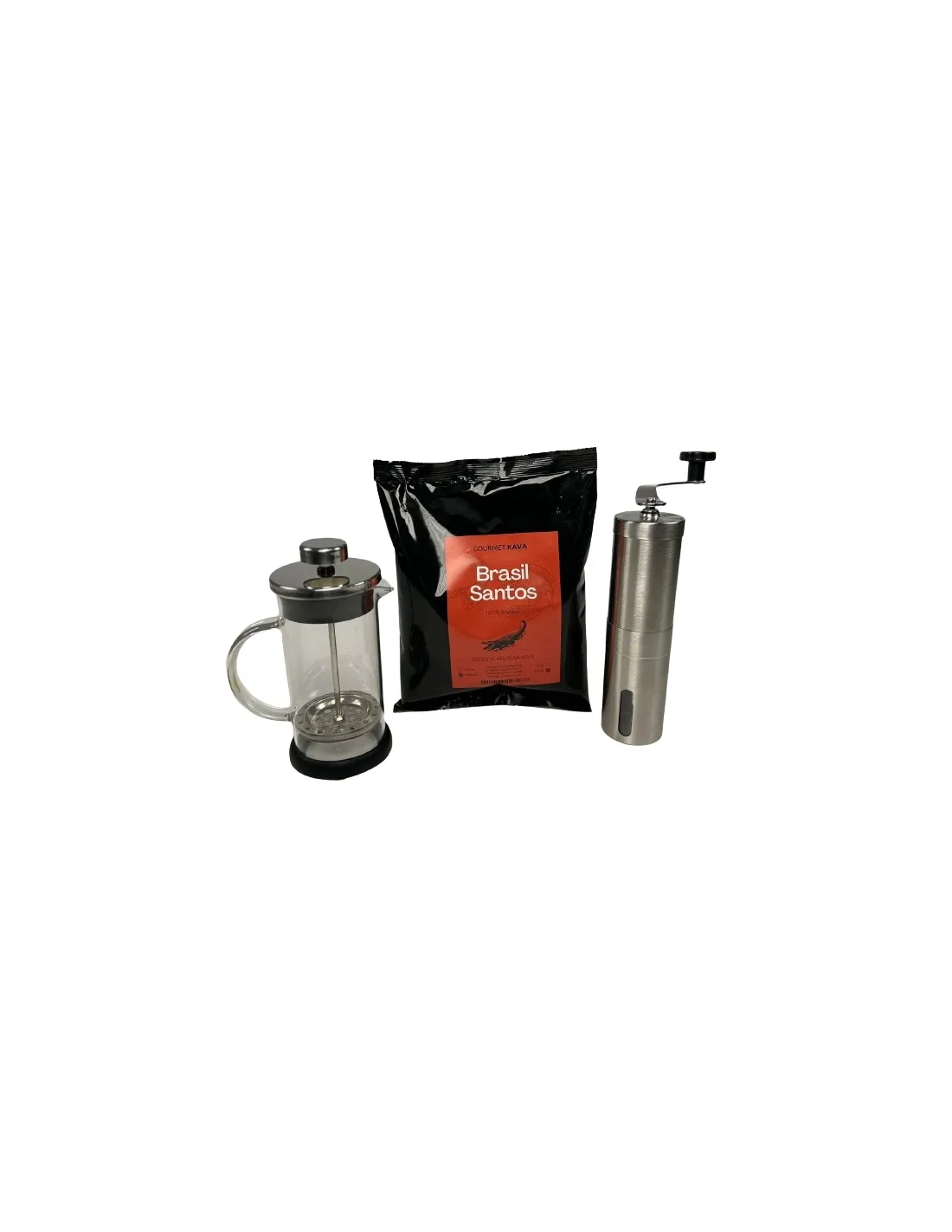 Пакетът съдържа ръчна мелничка за кафе Kaffia Tall, 250g пакет 100% арабика кафе Brasil Santos и не на последно място неръждаем френски прес 350ml за лесна подготовка на прясно кафе!