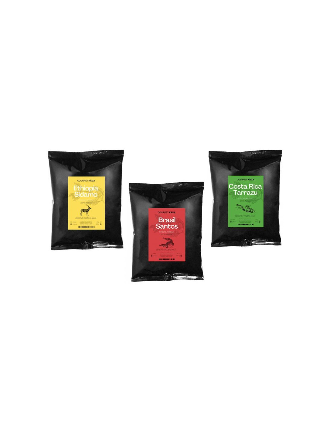- 1x 250g Бразилия Сантос средно изпечено, 1x 250g Етиопия Сидамо средно изпечено и 1x 250g Коста Рика Таразу средно изпечено