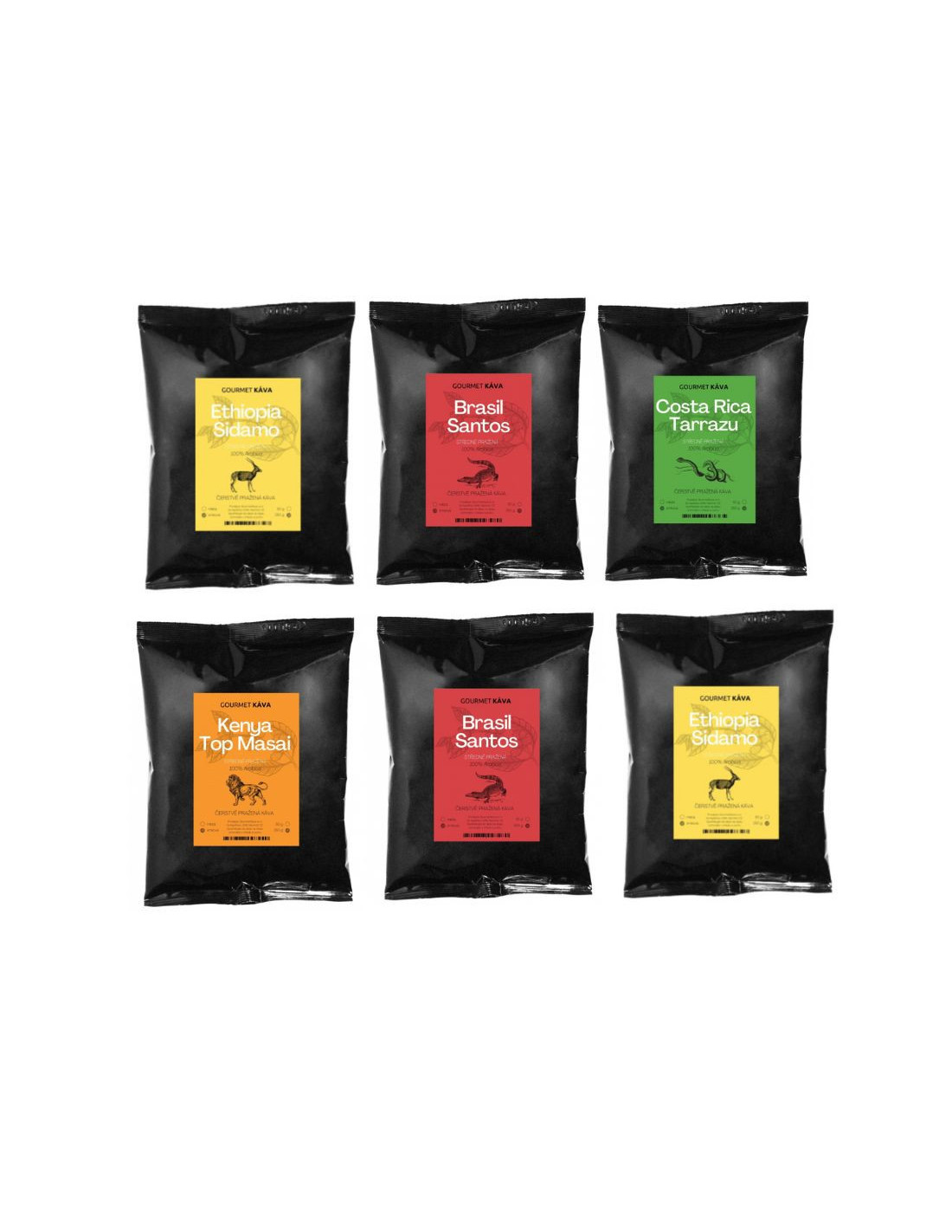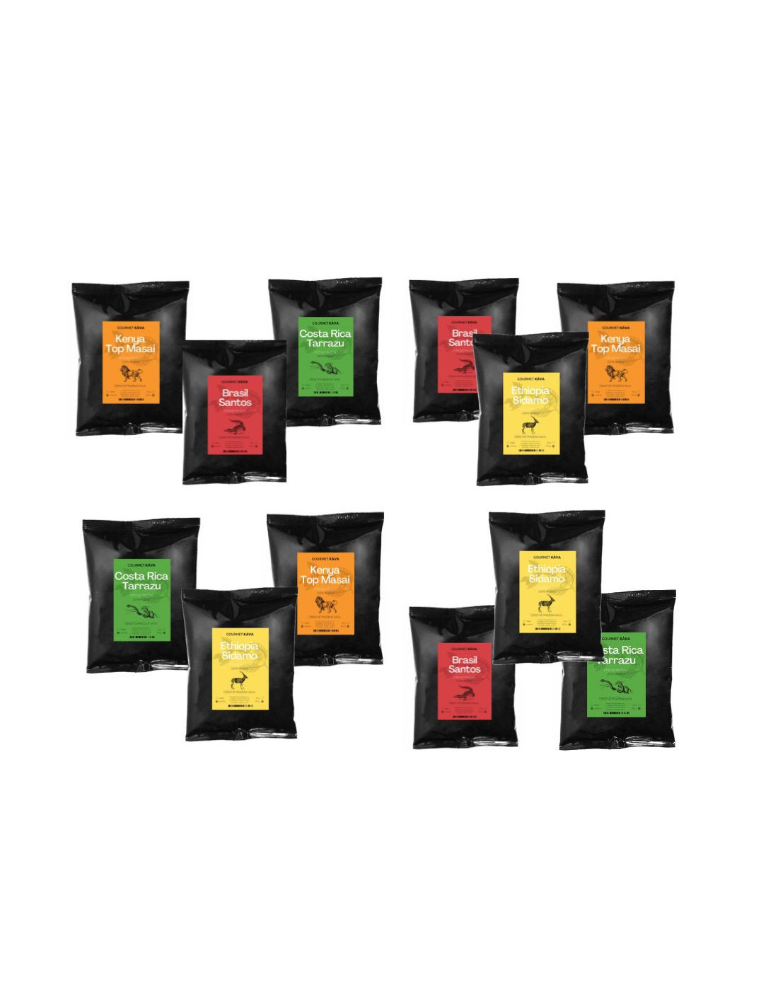 - 2x 250g Бразилия Сантос средно изпечено, 2x 250g Етиопия Сидамо средно изпечено, 1x 250g Коста Рика Таразу средно изпечено и 1x 250g Кения Топ Масай средно изпечено