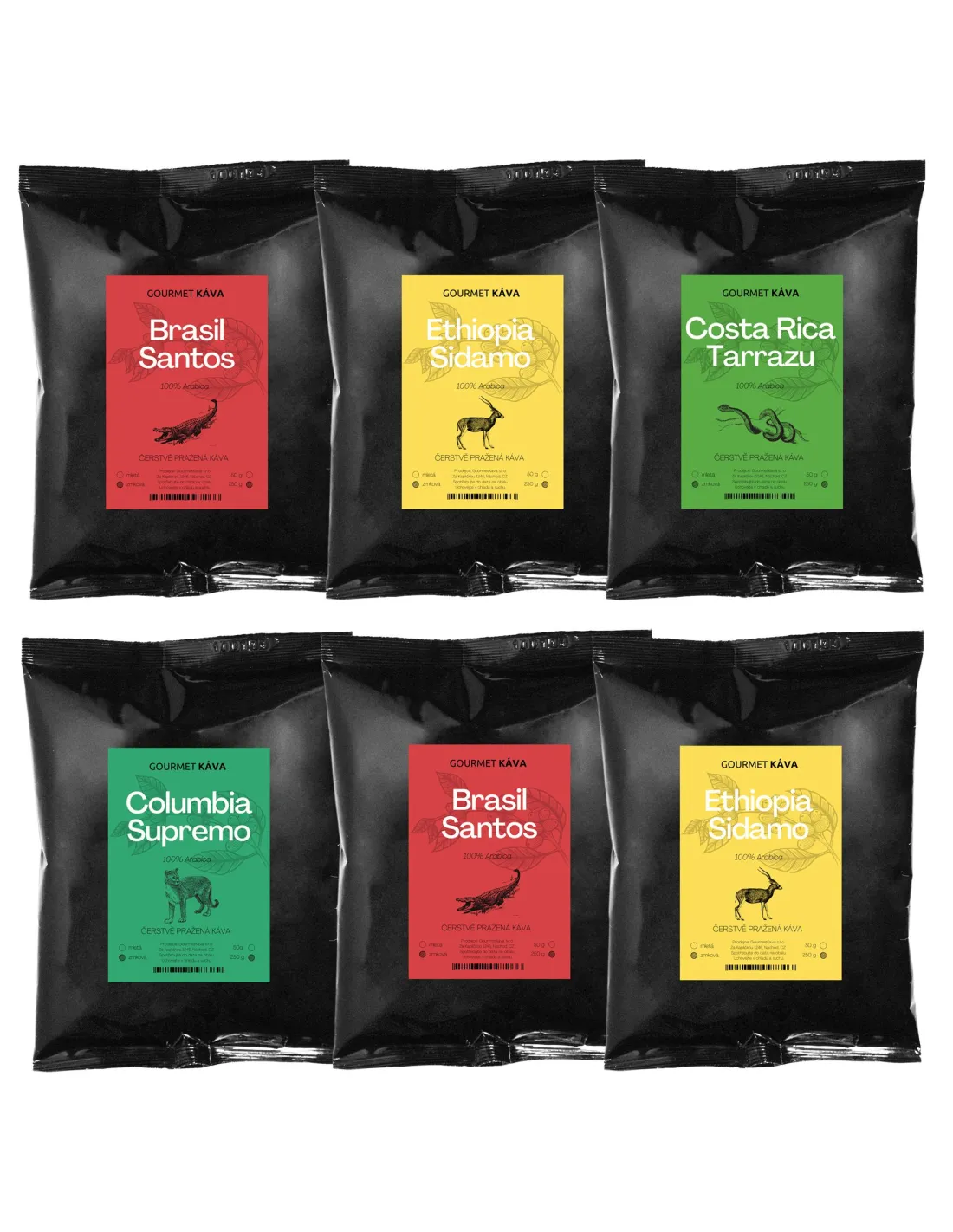 - Съдържание: 2×250 g Бразилия Сантос, 2×250 g Етиопия Сидамо, 1×250 g Коста Рика Тарасу, 1×250 g Колумбия Супремо.