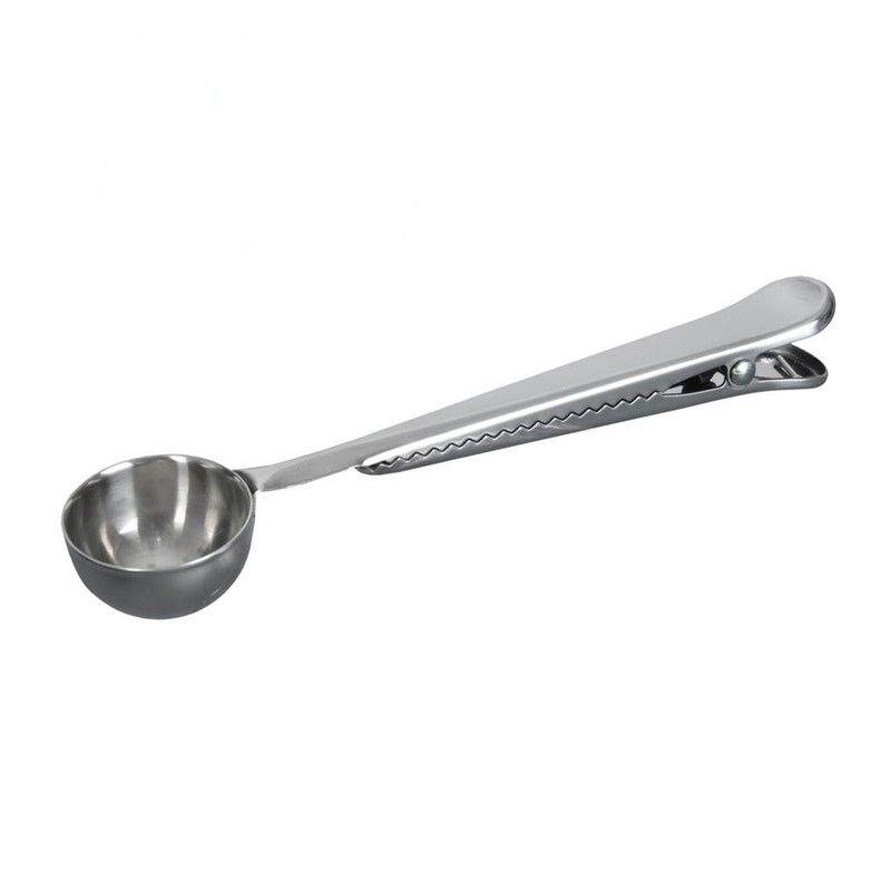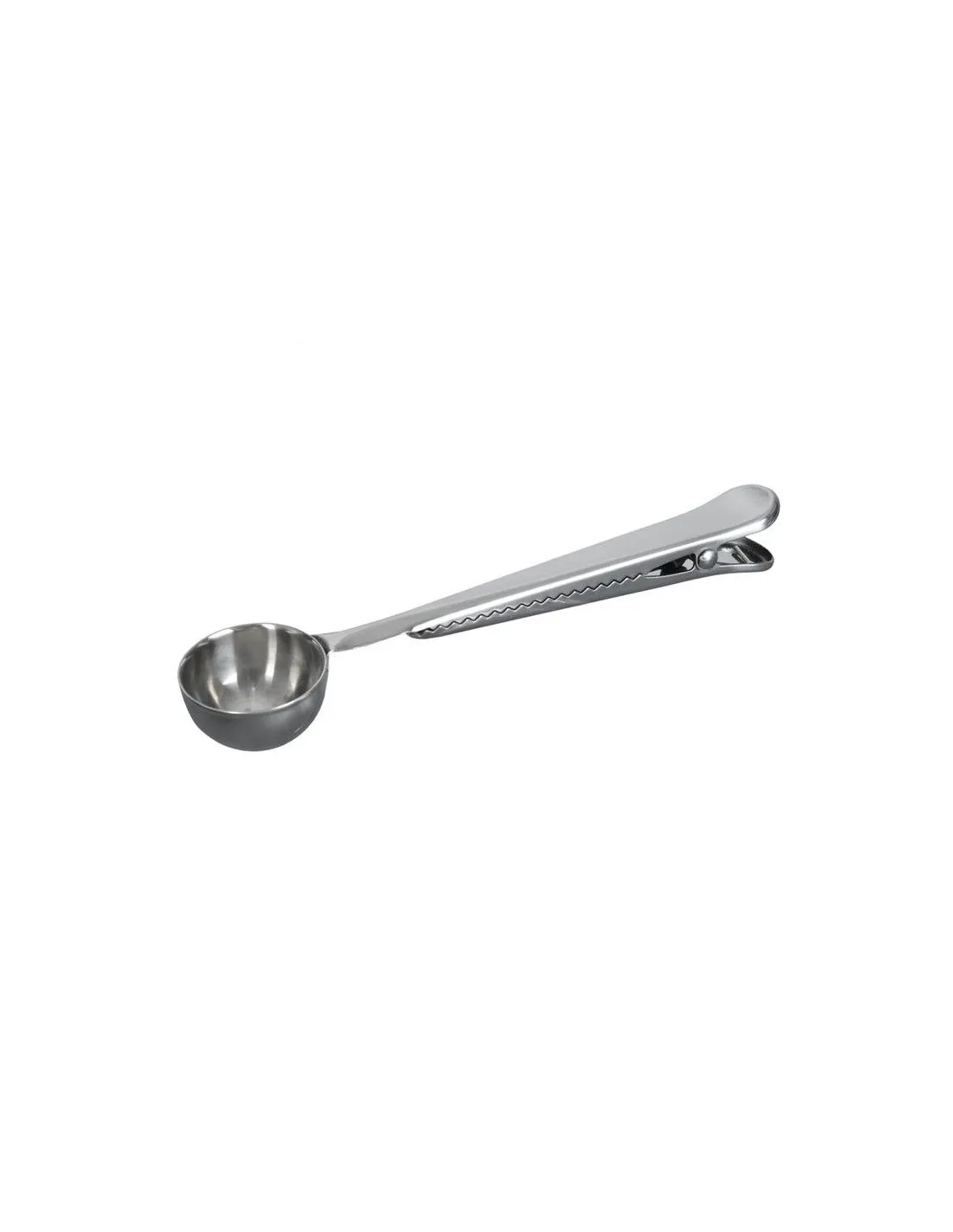 Изцяло изработена от неръждаема стомана мерителна чашка за удобно отмерване на 6 г смляно кафе и затваряне на пакета с кафе с щипка.
