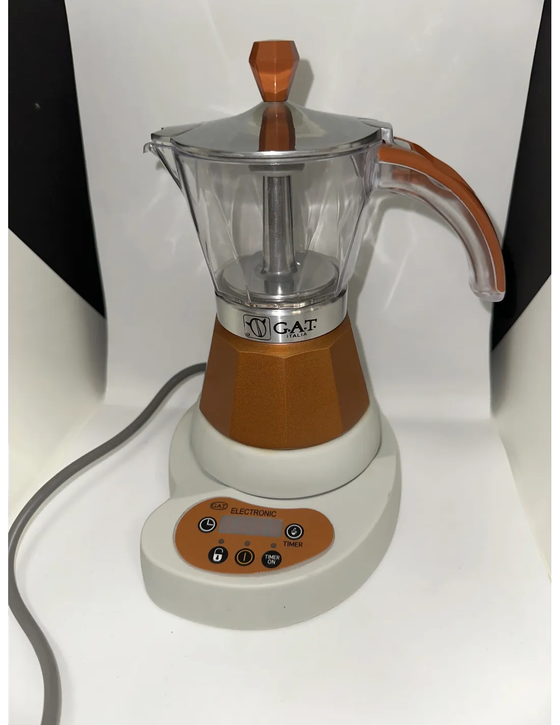 Електрическият мока кана G.A.T. Vintage с 4-6 чаши за приготвяне на силно и прясно кафе, където и да се намирате. Цвят: кафяв. Каната е използвана и без опаковка - ОТСТЪПКА.