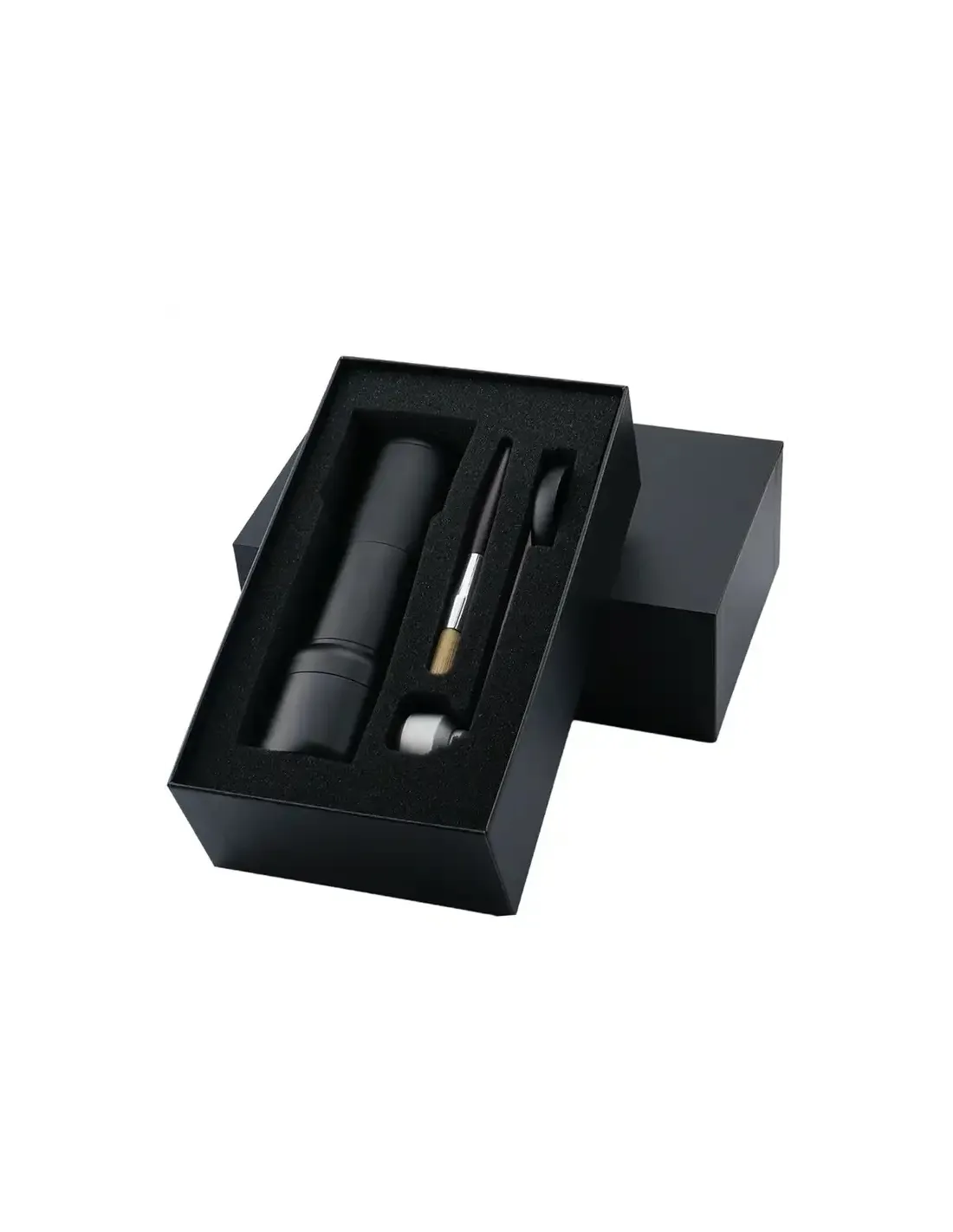 В опаковката са включени дървена четка за почистване на мелничката и USB-C кабел за зареждане, текстилна торбичка, ръководство, кутия.