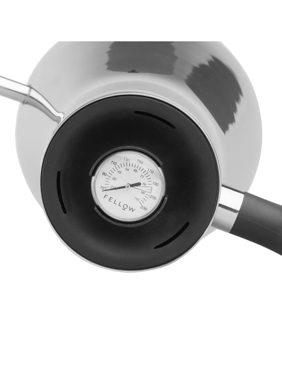 Каничка за вода Fellow Stagg от 1 л с вграден термометър и чучур, специално проектирана за прецизно наливане при приготвяне на алтернативно кафе. Сребърен цвят.
