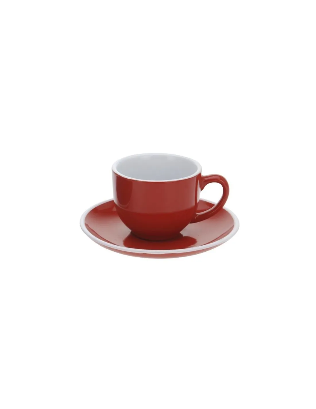 Керамична чаша за еспресо s обем 90 ml Подходяща за класическо или двойно еспресо. Включва чинийка. Цвят: червен.
