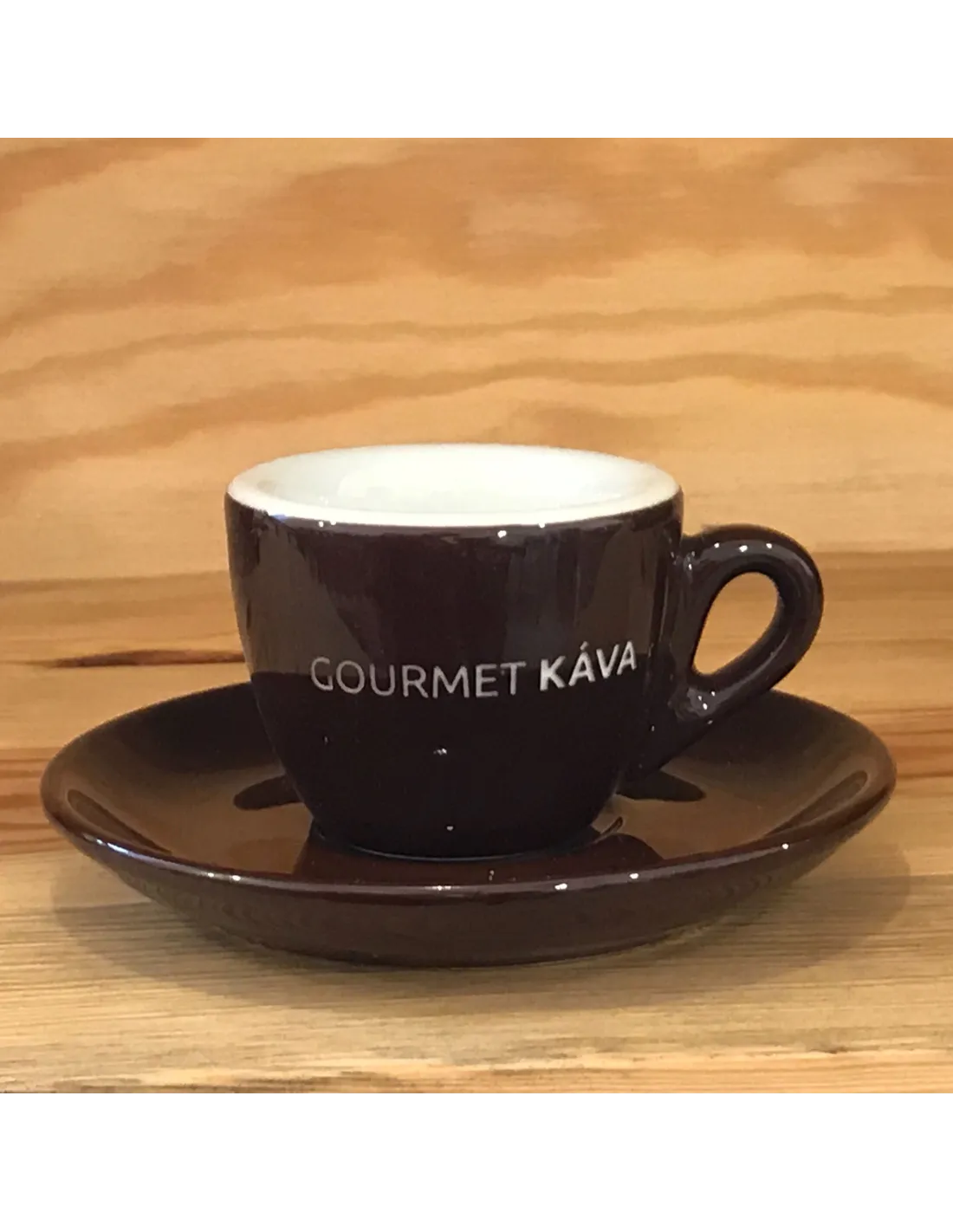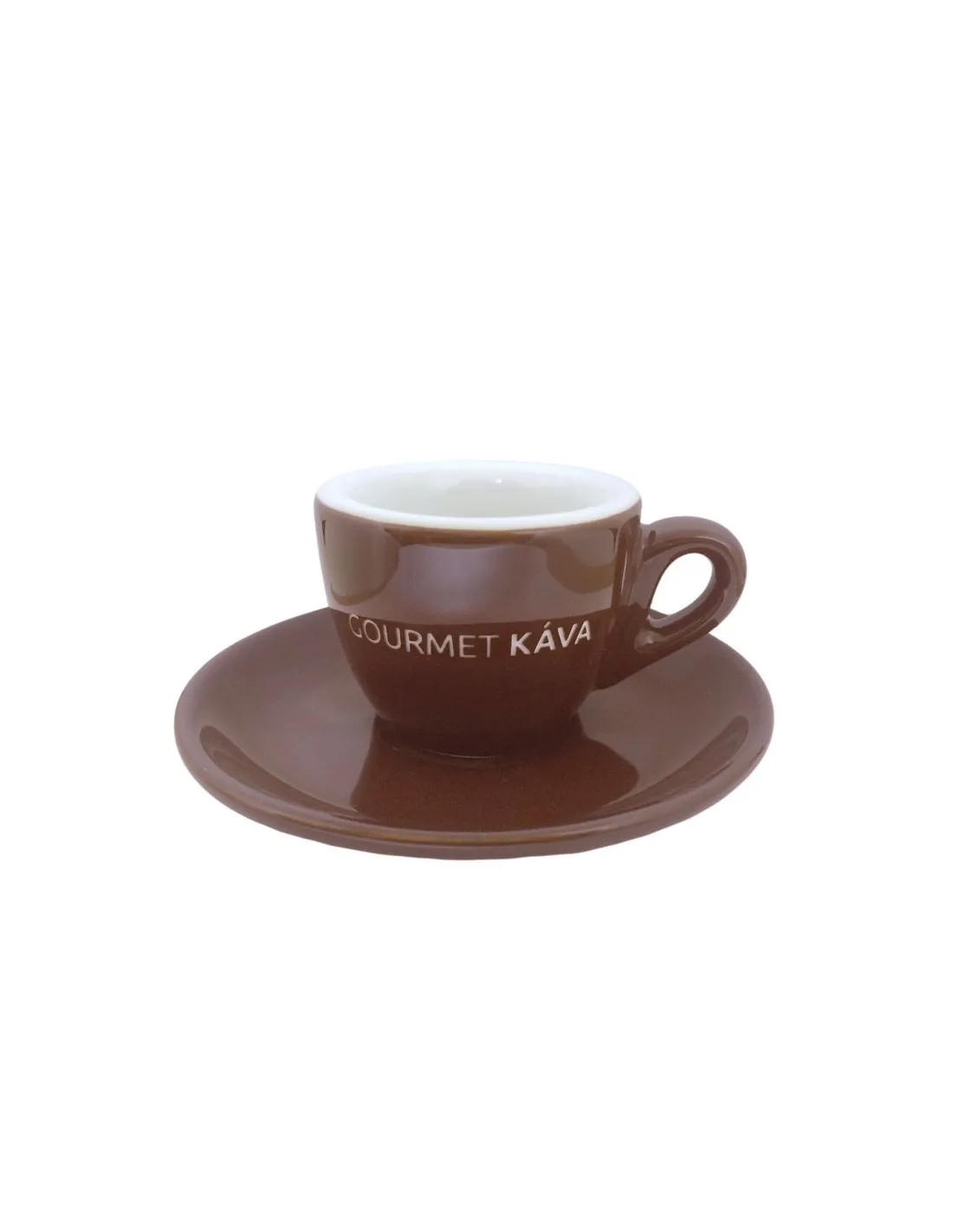 Порцеланова чаша за еспресо s обем 70ml Подходяща за класическо или двойно еспресо. Включва чинийка. Цвят: кафяв с бяло лого.