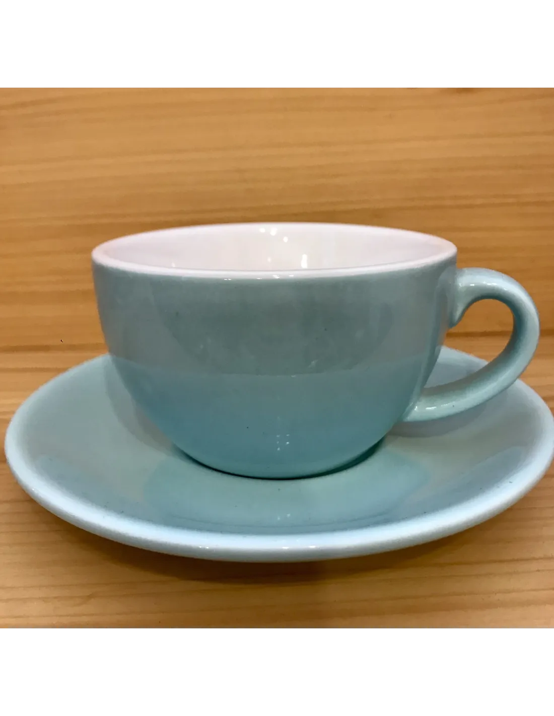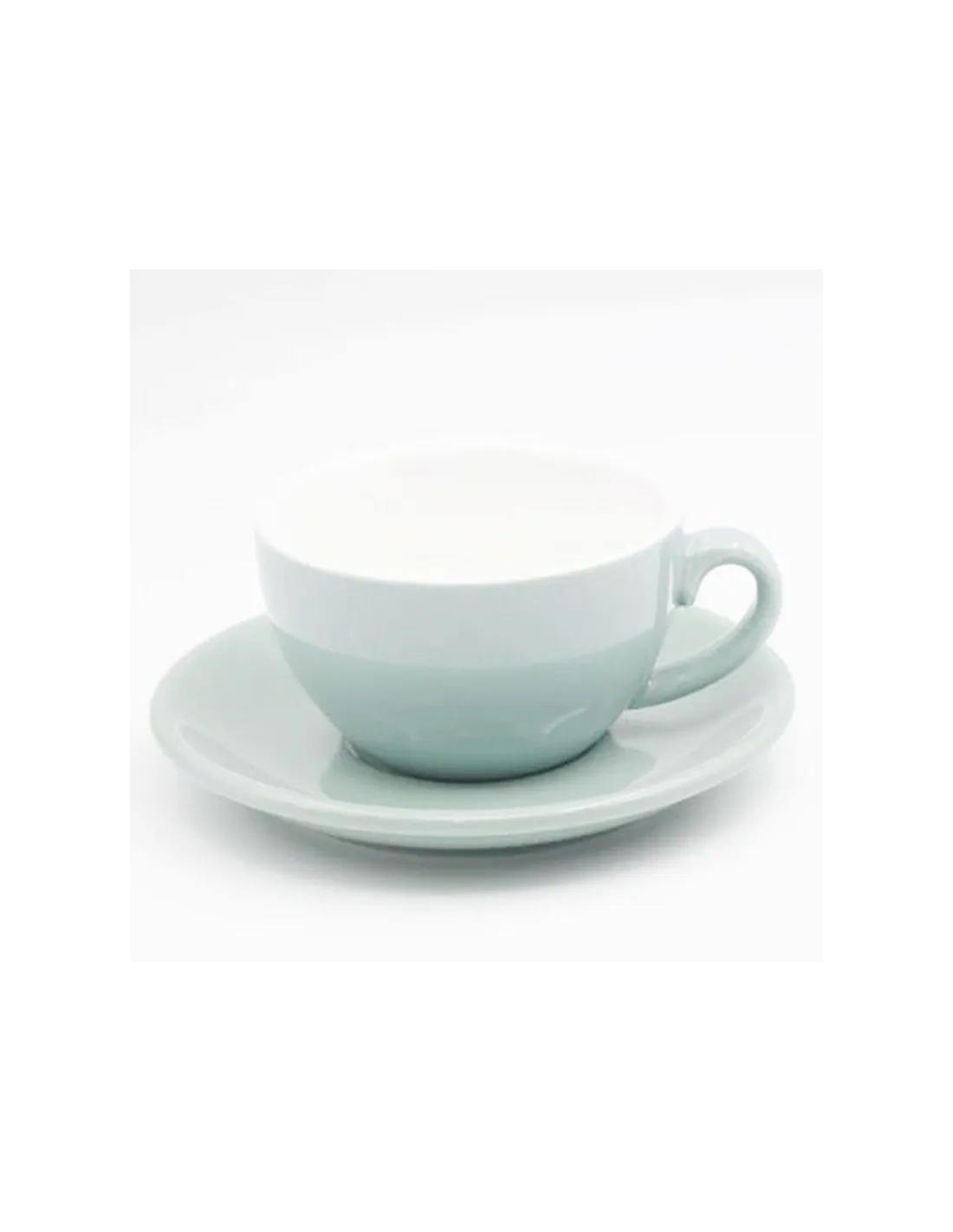 Порцеланова чаша за капучино с обем 200 мл . Включва и чинийка . Цвят: светло син .