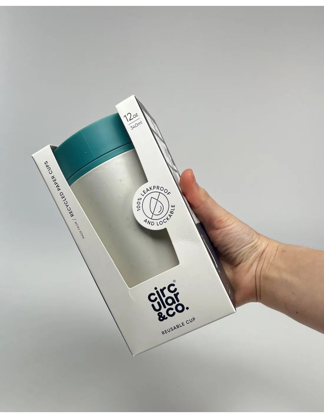 Стилна чаша rcup, изработена от рециклирани материали, практична и удобна за употреба. Елегантна цветова комбинация от креда и аквамарин за устойчив и модерен дизайн.