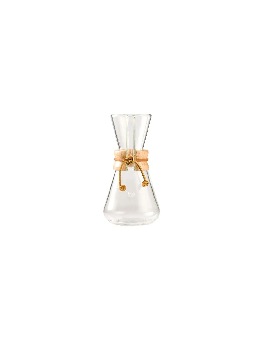 Chemex, на пръв поглед приличащ на касерола за вода, е изработен от боросиликатно стъкло и има дървен корсет в средата, придържан от кожена каишка.