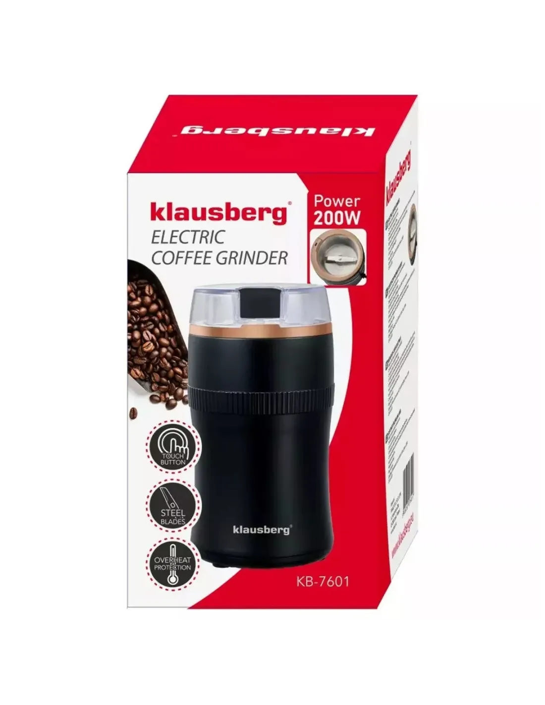 Електрическата кафемелачка Klausberg осигурява бързо и ефективно смилане благодарение на мощния си 200W мотор. Освен кафе, тя може да смила и ядки или подправки.