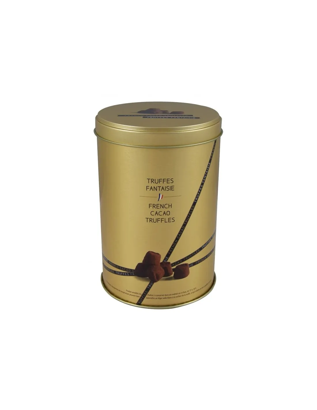 Изящни френски какаови трюфели с Marc de Champagne 3% бренди, опаковани в златист цилиндър с елегантен матов дизайн.
