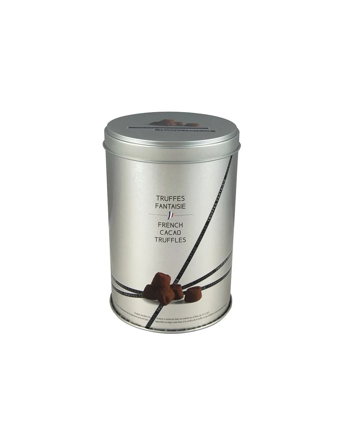 Деликатни какаови трюфели Mathez Fantaisie със солен карамел в елегантна сребро кутия. Чудесни с кафе или просто за забавление.