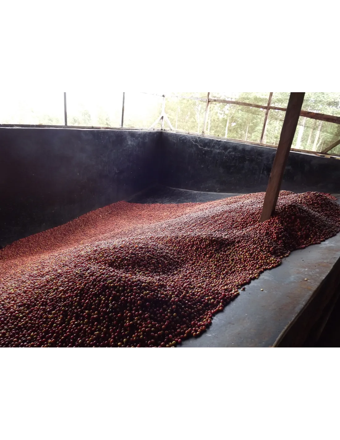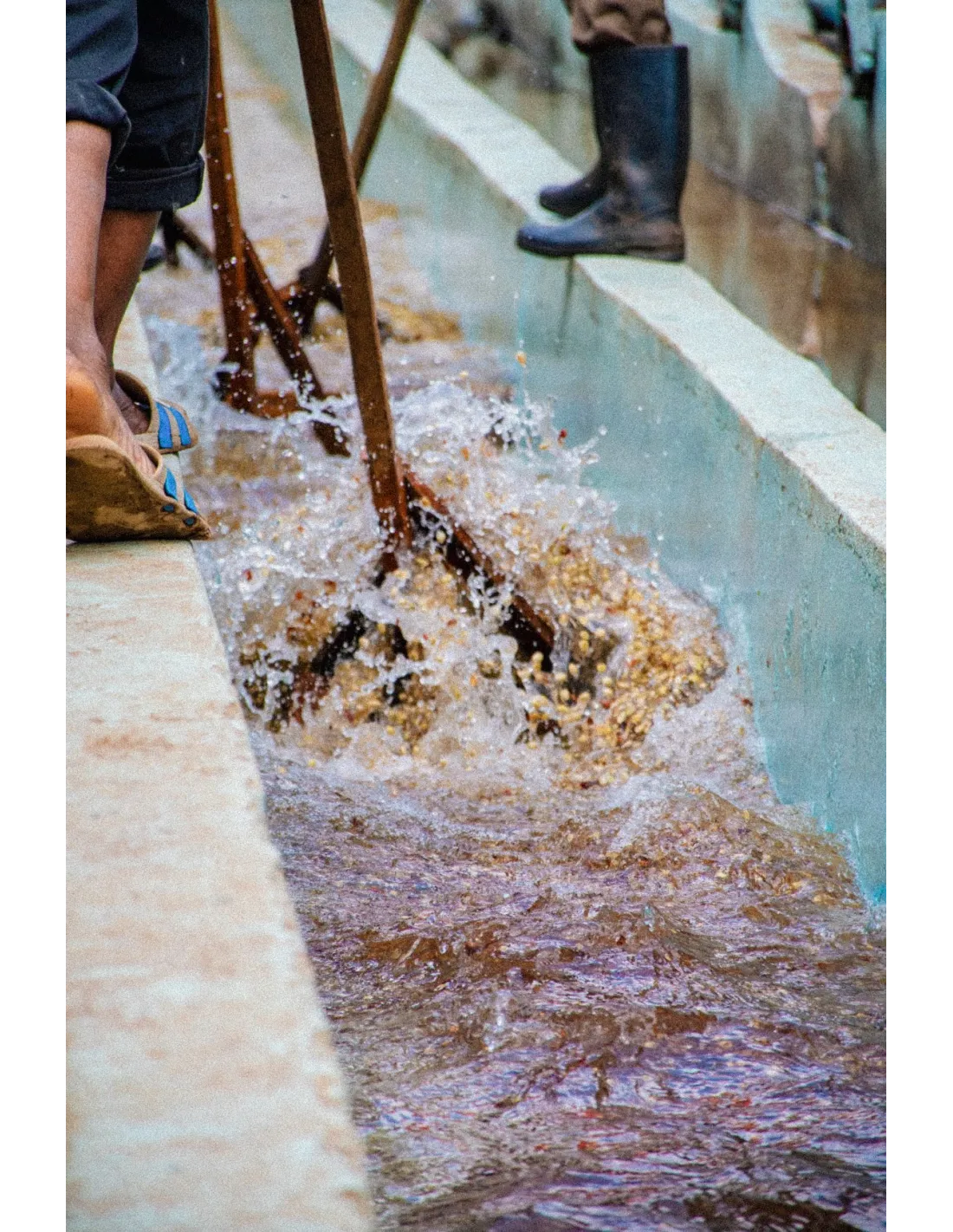 След доставката до мократа мелница черешите се сортират ръчно, за да се отстранят примесите и черните плодове. След това те се претеглят и записват. След това се преместват в бункер, където се обелват. След като черешите се обелят с помощта на преса с четири диска, те се прехвърлят в един от резервоарите за ферментация, където ферментират в продължение на около 16-24 часа в зависимост от температурата на околната среда. След това кафето се измива старателно в наклонени водни канали, за да се отстрани остатъчната целулоза.