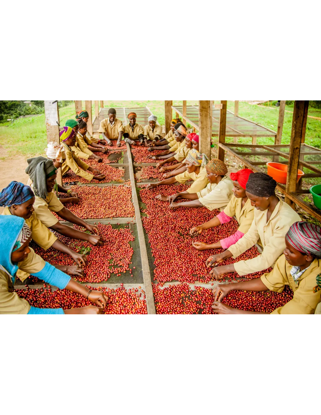 Събиране на реколтата и третиране след прибирането ѝ - След като черешите бъдат закупени от производителите, кафето Ngororero преминава през строг процес на сортиране. Първо, персоналът на миялната станция отстранява всички некачествени череши чрез флотация. След това специално обучен персонал проверява визуално останалите череши за наличие на визуални дефекти.