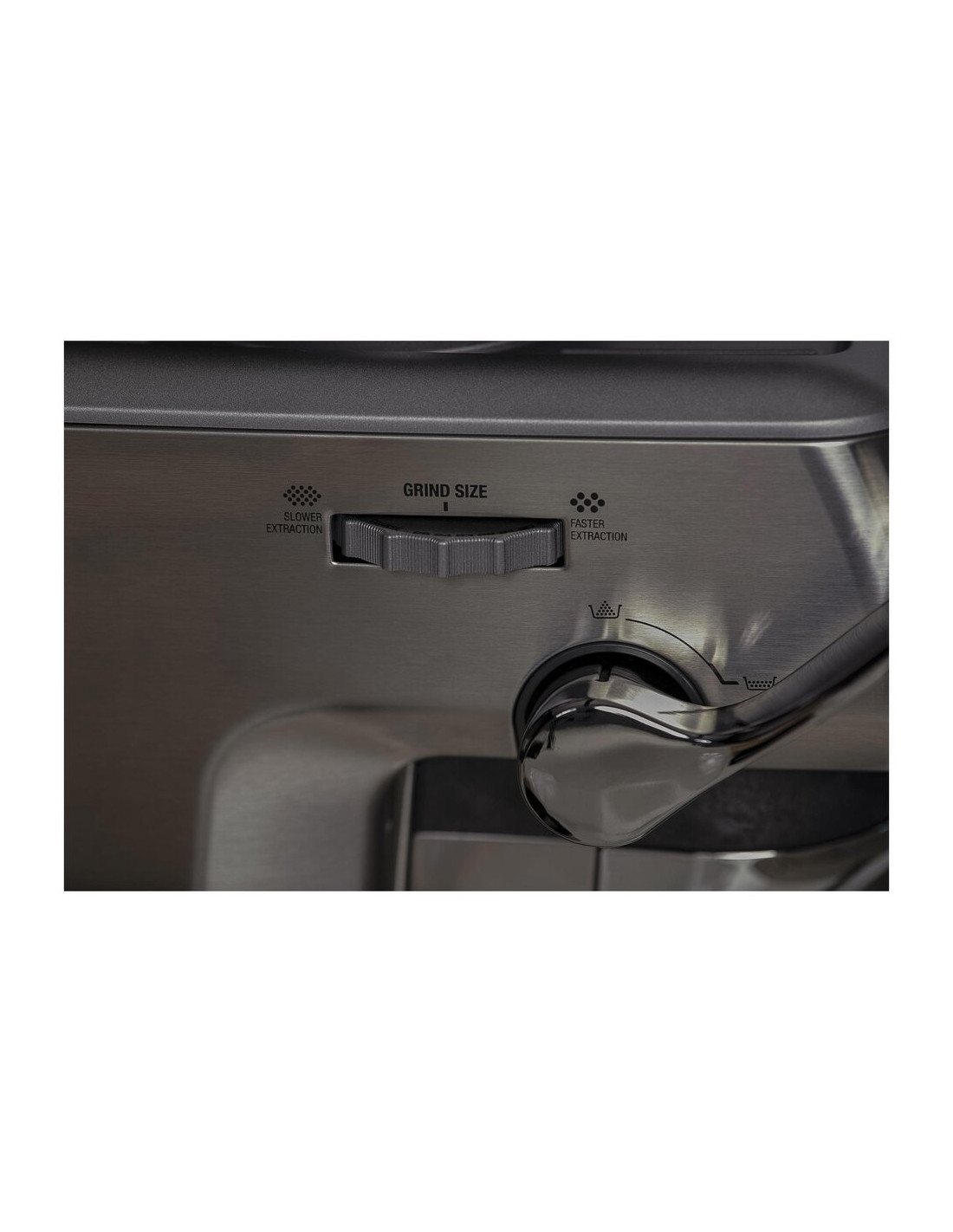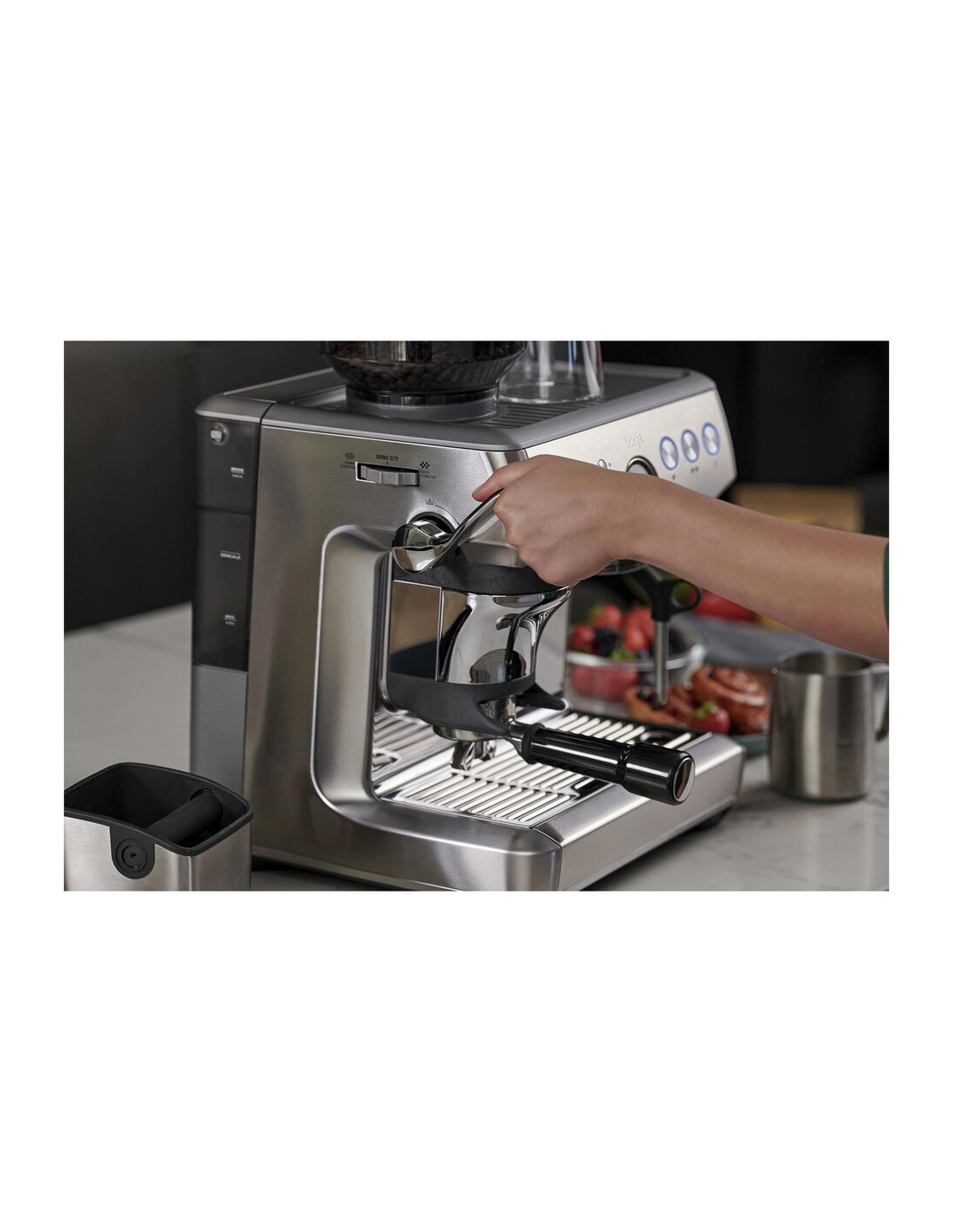 Вградената мелничка с метални конусовидни камъни предлага 25 степени на грубост, а автоматичното смилане директно в лоста спестява време и място.