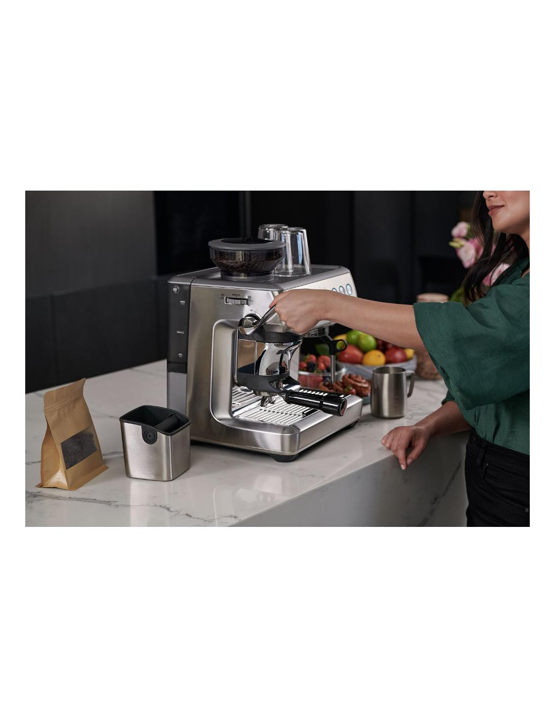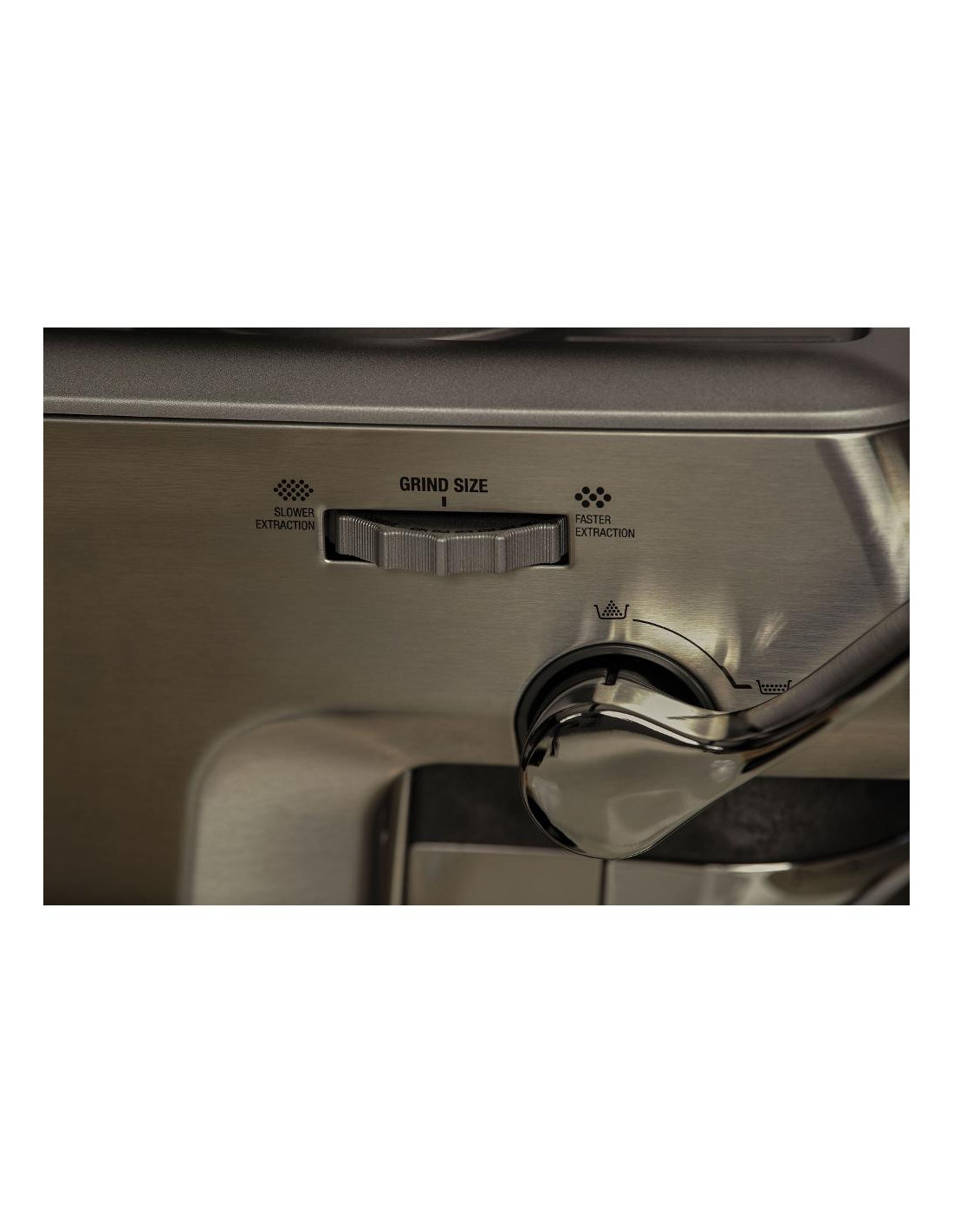 Вградената кафемелачка с метални конусовидни камъни предлага 25 степени на грубост, а автоматичното смилане директно в лоста спестява време и място.