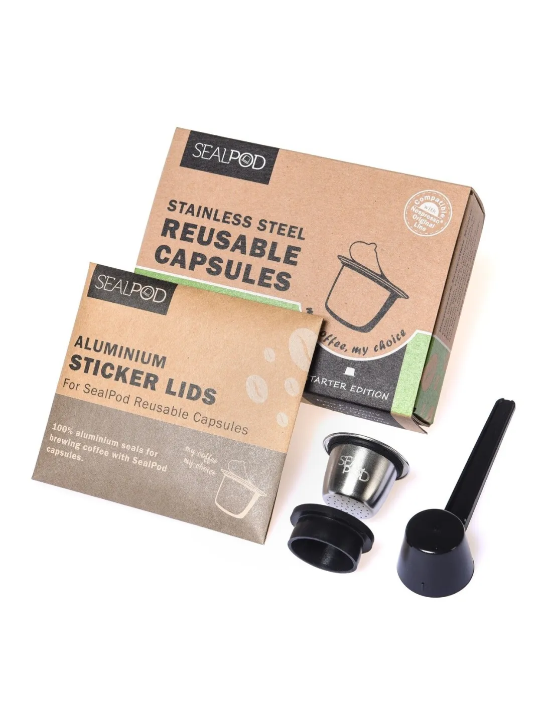 Капсула Sealpod отнеръждаема стомана за многократно пълнене, съвместима с кафемашините Nespresso®, за приготвяне на прясно кафе по ваш избор на малка част от цената. Включени стикери!
