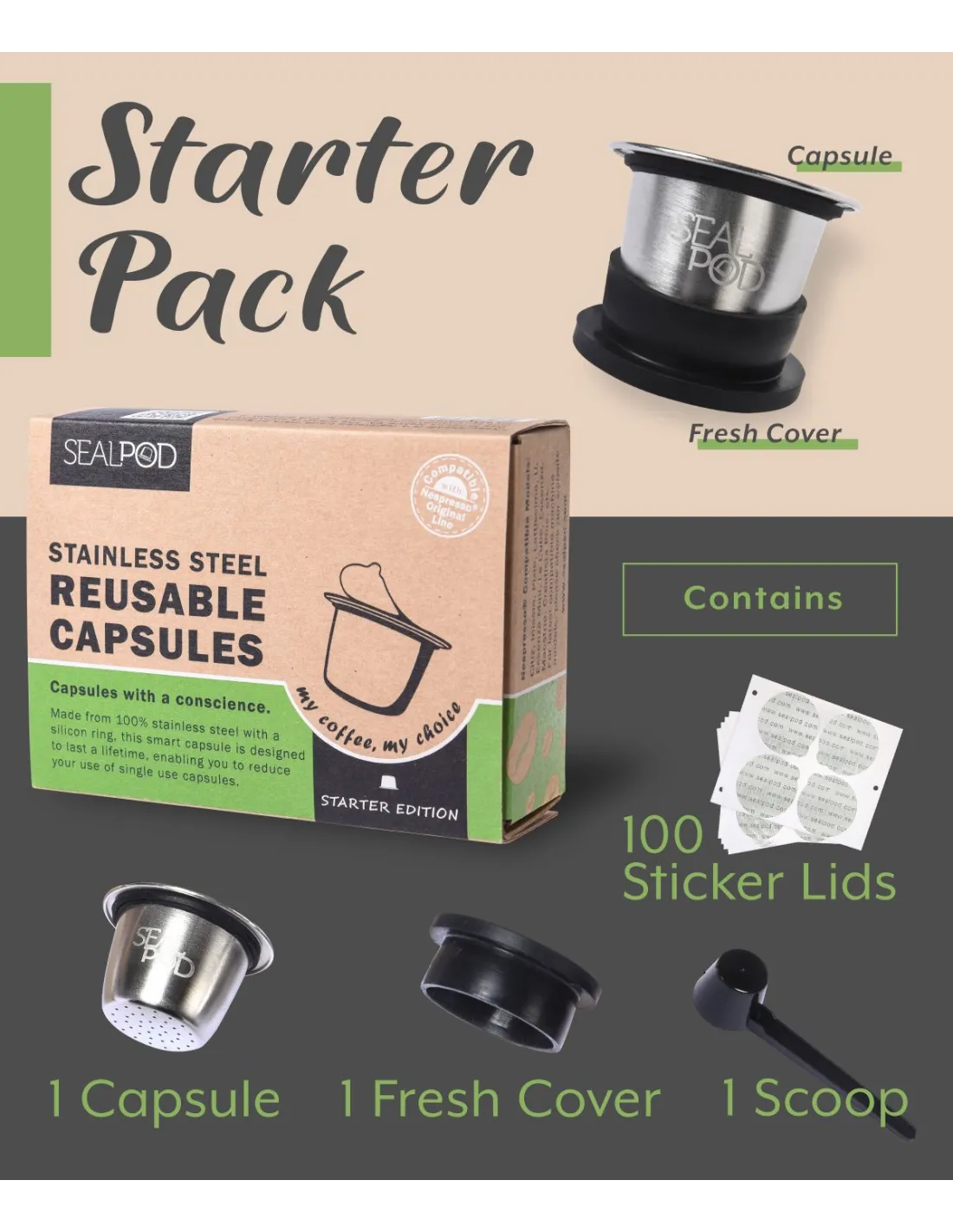 Всяка опаковка съдържа: 1x капсула Sealpod от неръждаема стомана, 1x мерителна чашка, 1x черна капачка за запазване на свежестта, 100x самозалепваща се капачка (може да бъде закупена >>тук<<)