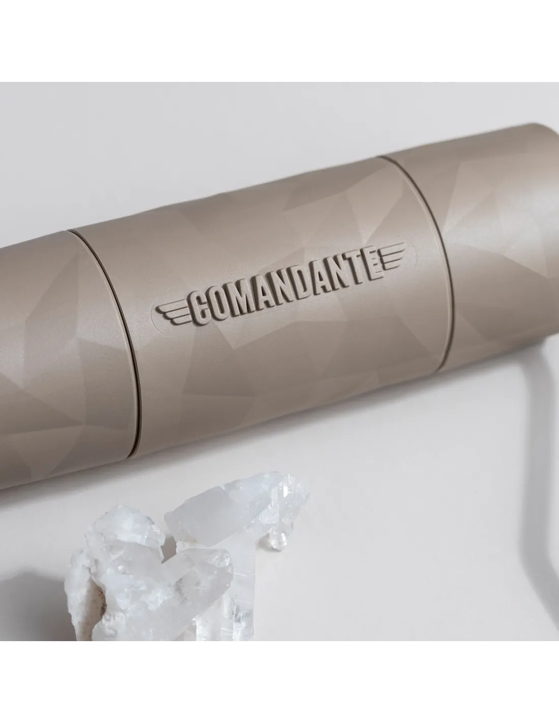 При проектирането на външна кафемелачка изборът на най-добрия материал за корпуса е от решаващо значение. След обстойни изследвания в лабораториите и задълбочени тестове на място инженерите на Comandante избраха за новата линия продукти за работа на открито материал, наречен QTP® - специално подсилен високосилициев технополимер. QTP® е високоефективен технополимер със значително количество кварцови подсилващи частици в гъвкава и здрава дълговерижна полимерна матрица. На допир той наподобява керамика и функционира като технически суперкомпозит.