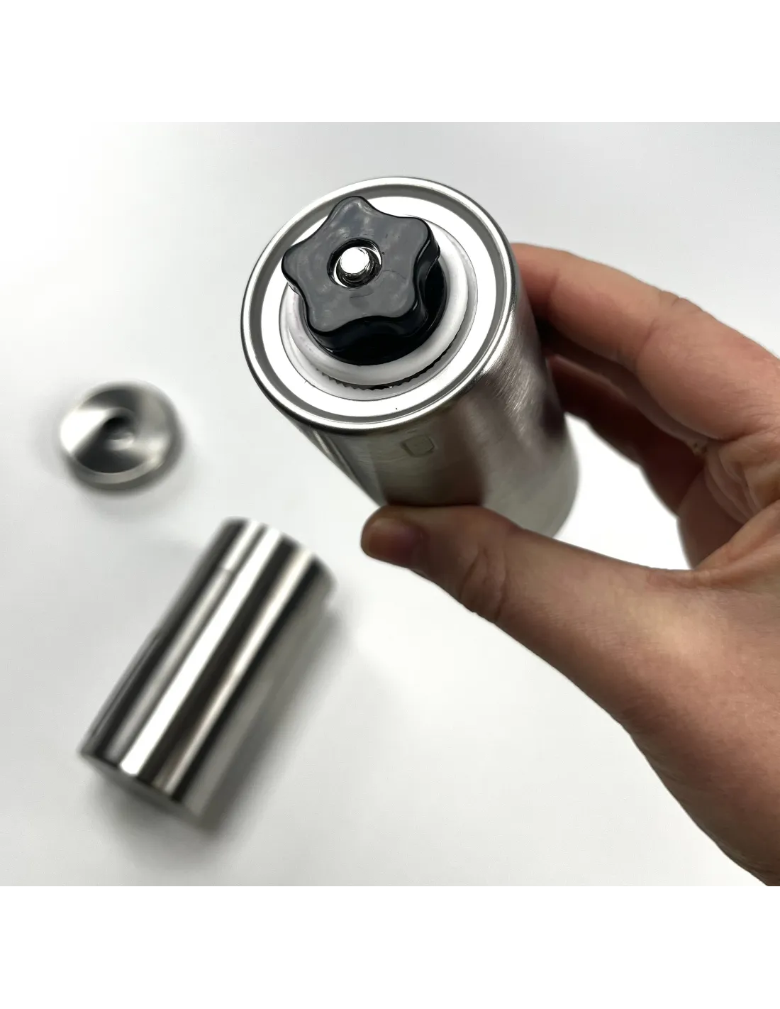 Изцяло неръждаема, елегантна ръчна мелница Kaffia Tall с керамични мелнички за бързо и удобно мелене дори в движение.