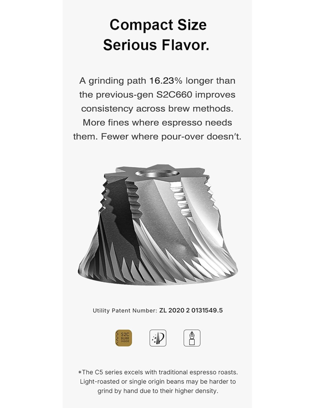 Ръчната шлайфмашина Timemore C5 Pro Black от новото поколение на серията C осигурява изключителна комбинация от прецизност, производителност и издръжливост. Тя разполага с иновативните камъни за мелене S2C-042-III с диаметър 42 мм, които позволяват по-бързо, по-равномерно и стабилно мелене в сравнение с предишните модели.