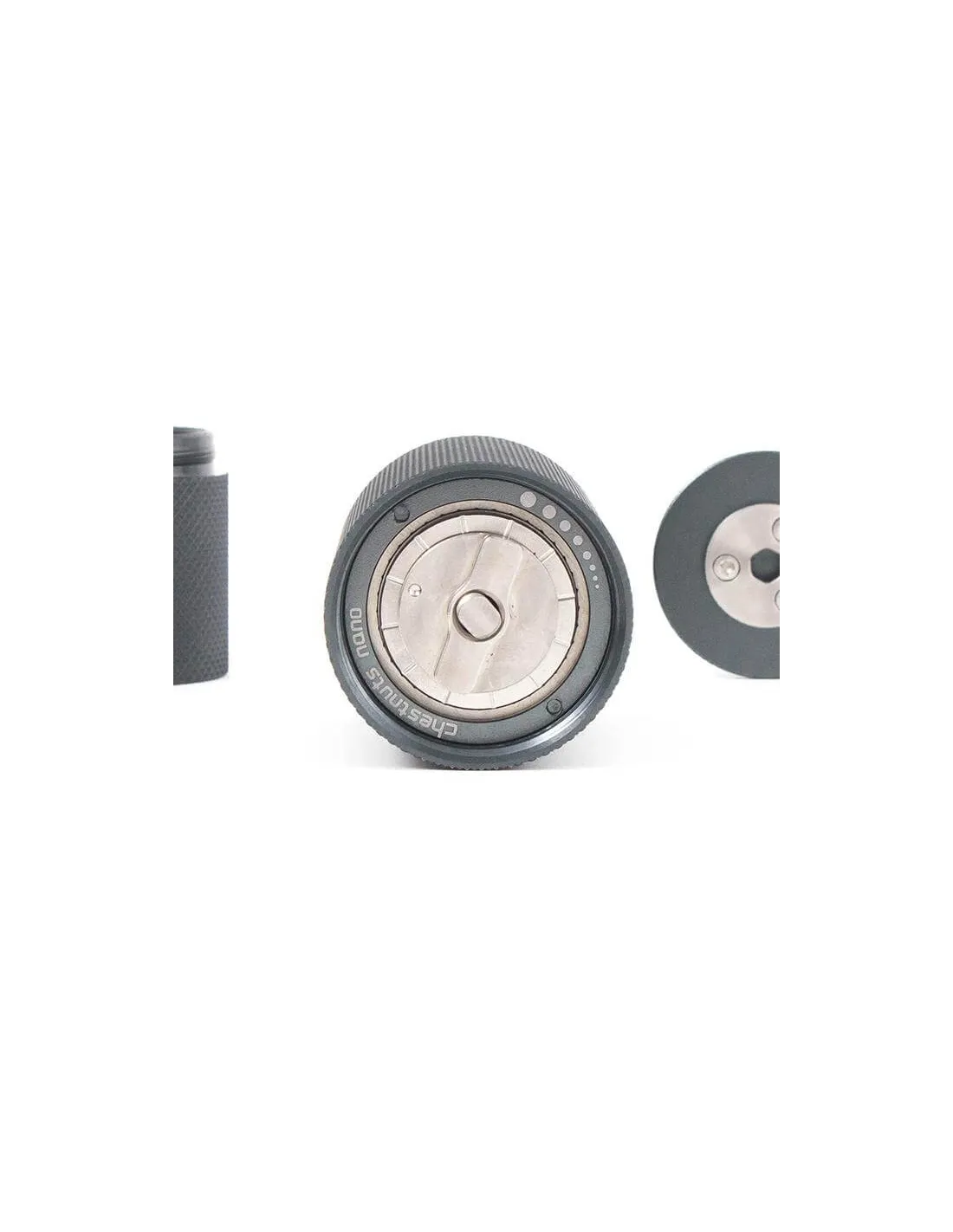 Timemore Nano е компактна малка мелница с отлична изработка, изработена от едно единствено парче алуминий. Идеална за пътуване. Мелничката е оборудвана с прецизни конични камъни от закалена стомана и 2 лагера, които позволяват изключително точно и постоянно смилане. Грубостта се регулира лесно с въртяща се гайка в долната част на мелницата.