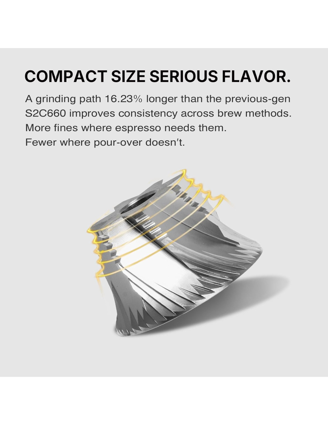 По-големият диаметър означава 19% по-голям камък, 16% по-дълъг път на смилане и до 5% по-последователно смилане - всичко това при запазване на компактния дизайн.