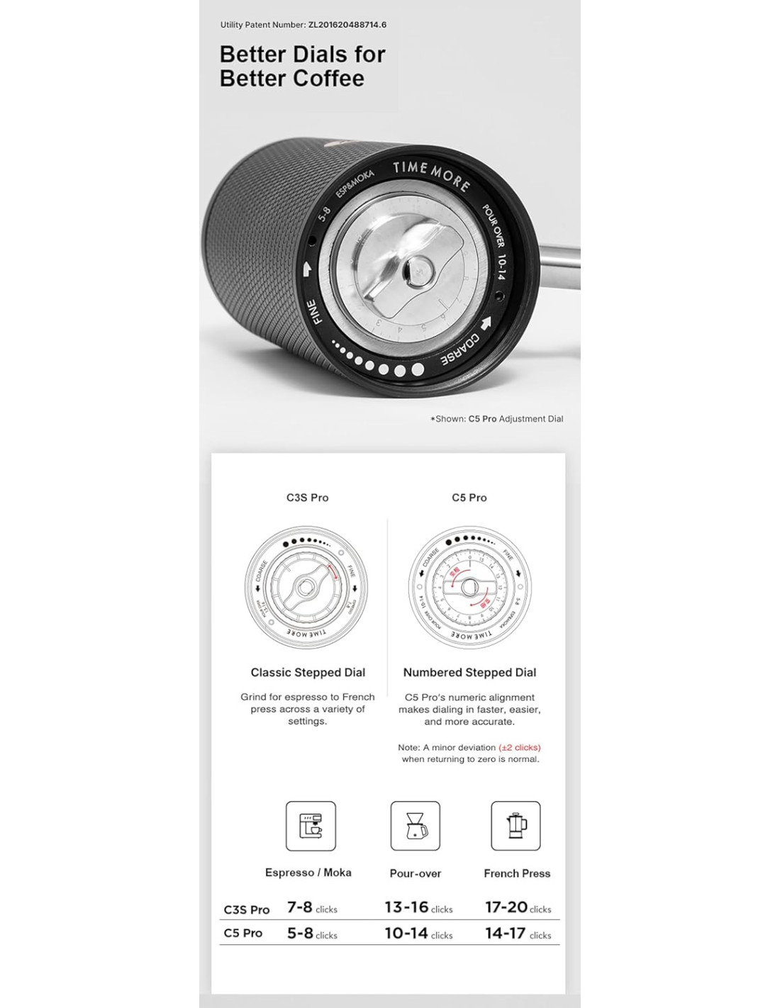 Ръчната шлайфмашина Timemore C5 Pro Black от новото поколение на серията C осигурява изключителна комбинация от прецизност, производителност и издръжливост. Тя разполага с иновативните камъни за мелене S2C-042-III с диаметър 42 мм, които позволяват по-бързо, по-равномерно и стабилно мелене в сравнение с предишните модели.