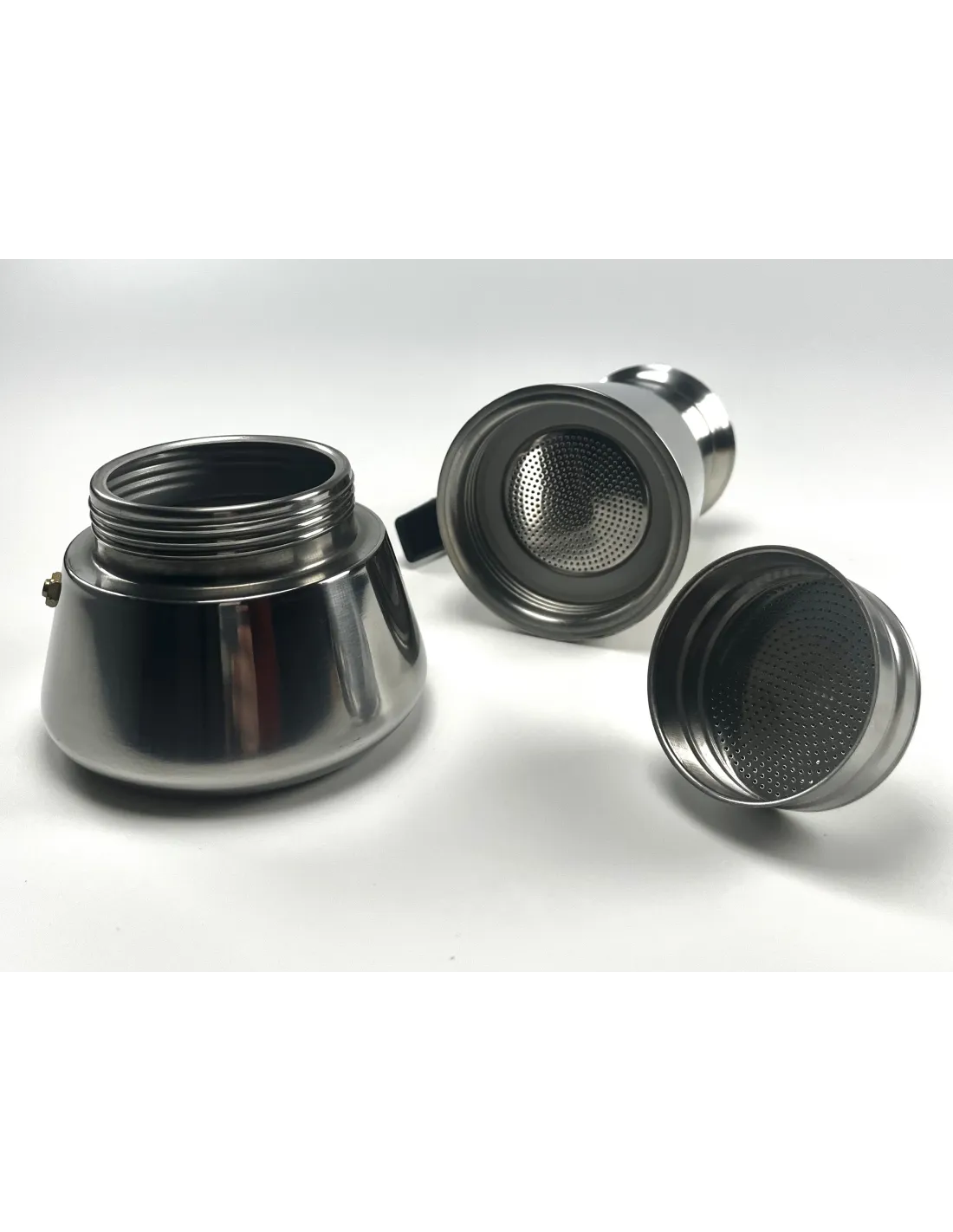 Мокакана от неръждаема стомана за 6 чаши мока кафе. Прост метод за приготвяне, много близък до еспресото, но на част от цената. Обем: приблизително 302,2 ml . Подходяща е и за индукционни котлони!