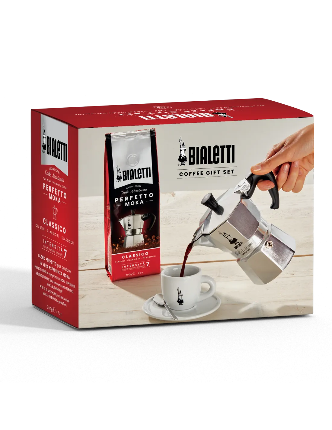 Легендарният мока кана Bialetti Moka Express на италианската компания Bialetti за традиционно приготвяне на по-силно кафе. Подходяща за 3 чаши, т.е. приблизително 130 ml. Подаръчно опакован с 200 г кафе Bialetti.