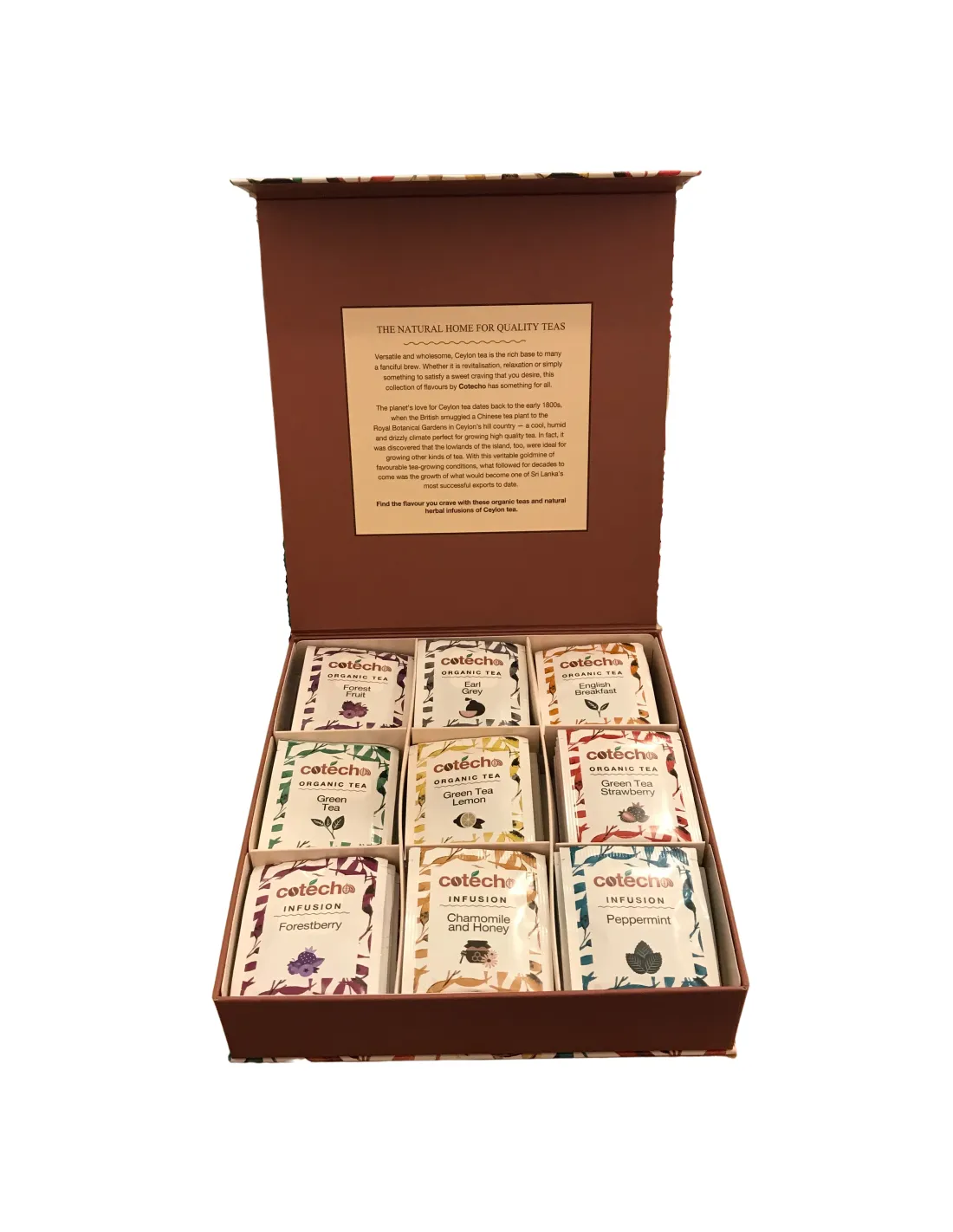 Универсалният и здравословен цейлонски чай е богата основа за много фантастични напитки. Независимо дали става дума за съживяване, релаксация или просто за нещо, което да задоволи апетита ви за сладко, в тази колекция от вкусове на Cotecho има за всекиго по нещо.