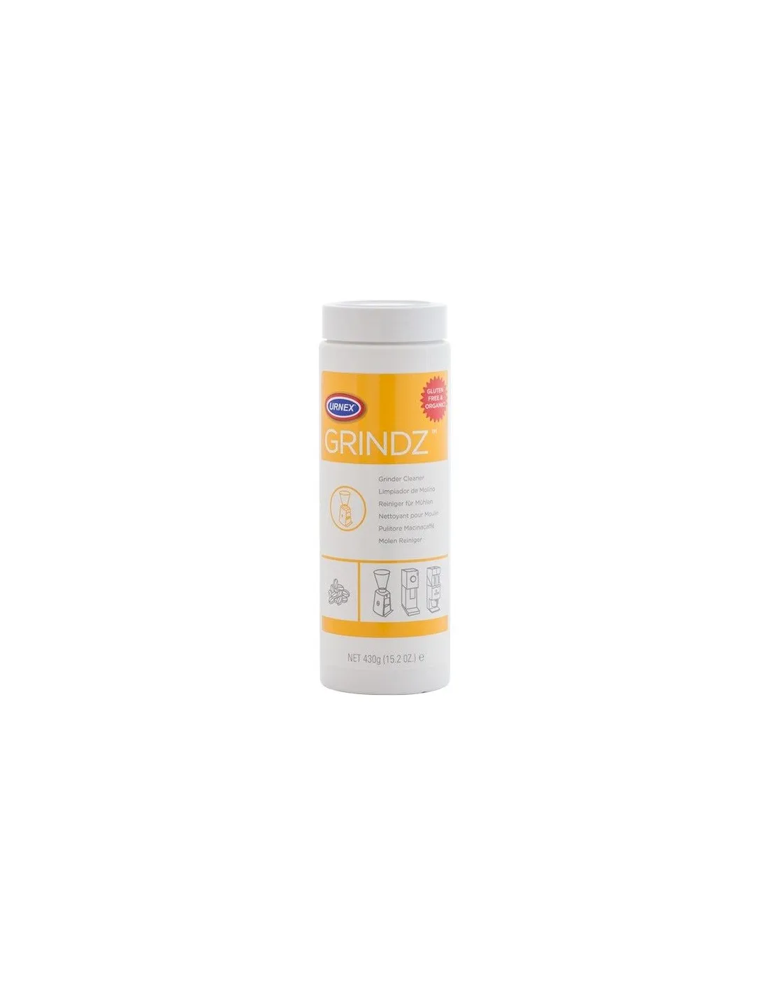 Патентованият продукт Urnex Grindz за безопасно и цялостно почистване на кафемелачките от масла от кафе. Съдържание: 430 г почистваща смес.