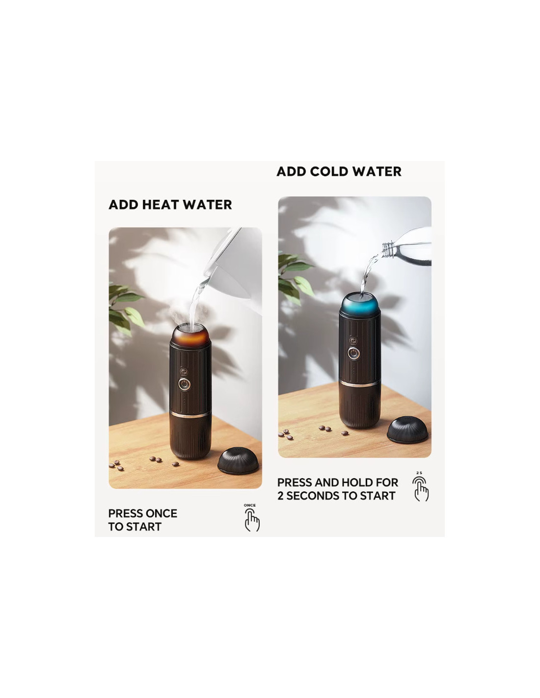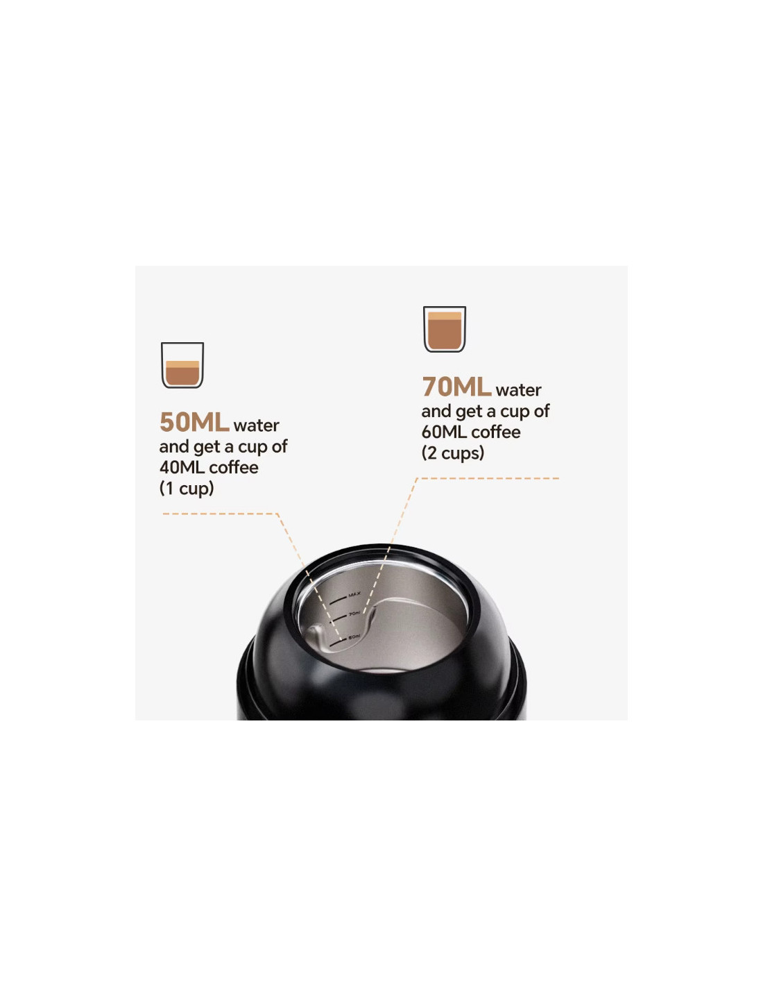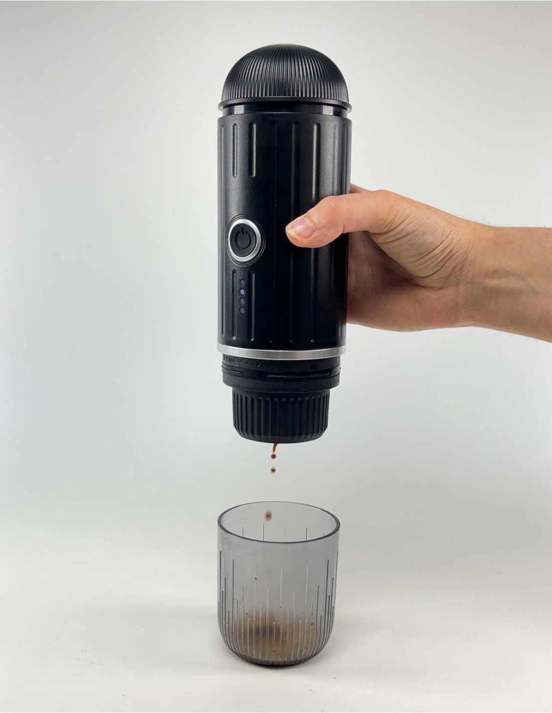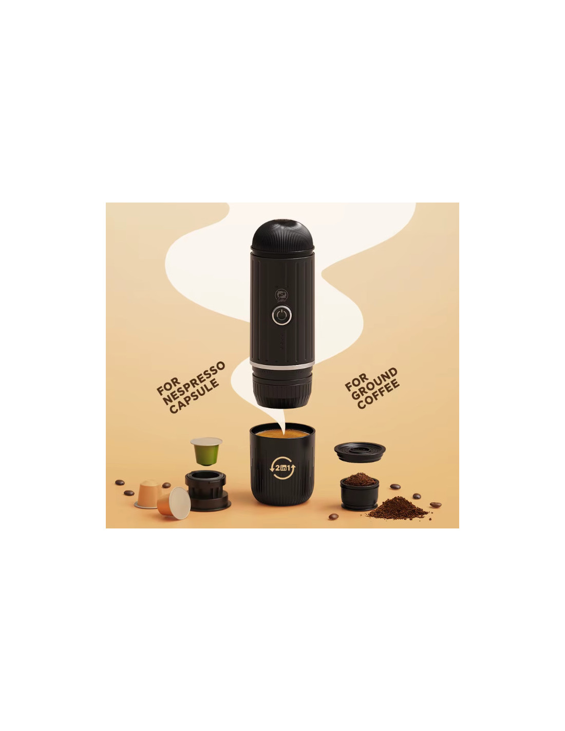 Пътна кафемашина за капсули и мляно кафе с батерия с капацитет 7500 mAh, която загрява вода дори без електрически контакт. Еспресо по всяко време и навсякъде.