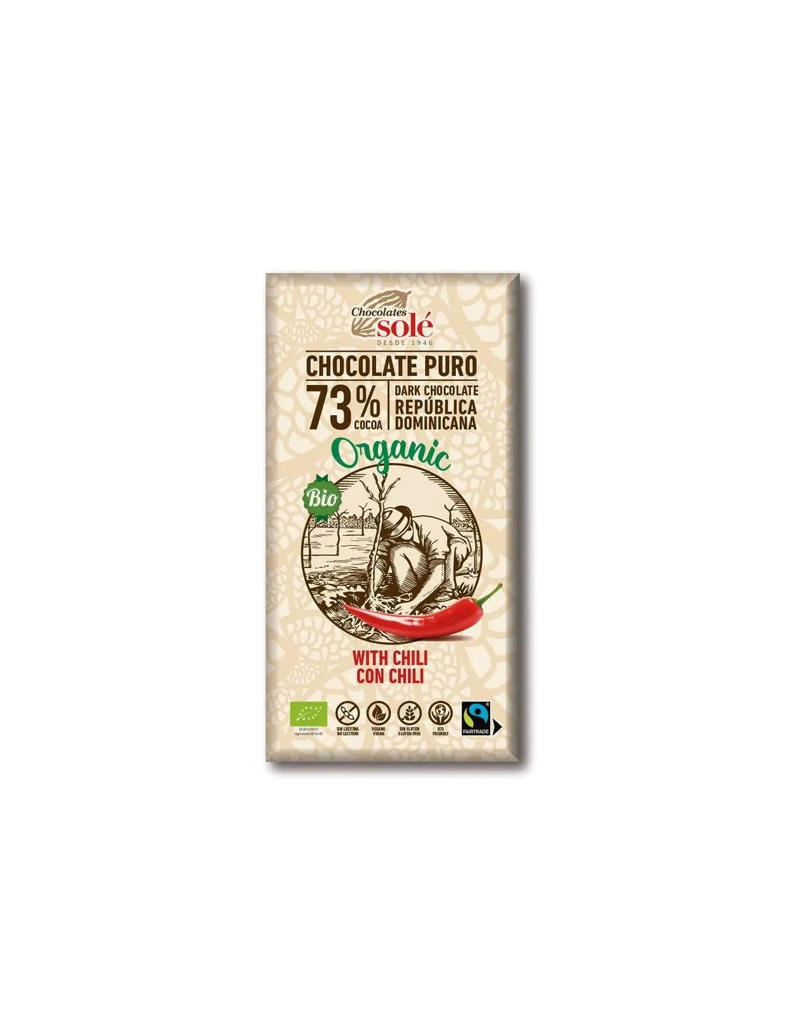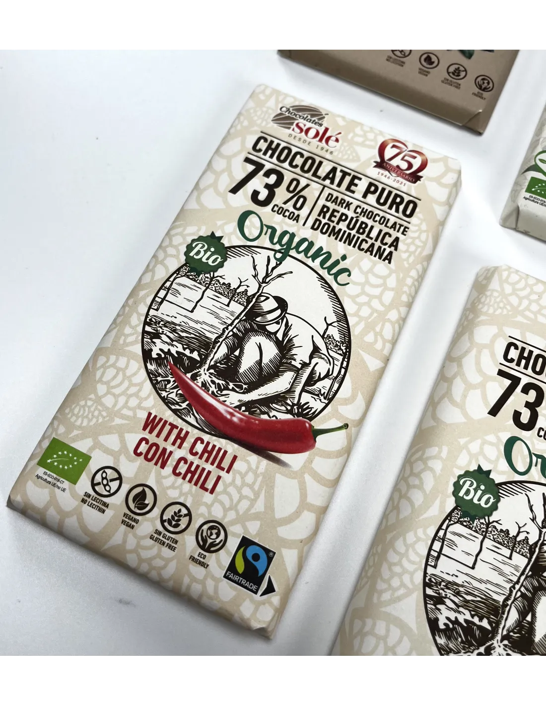 Този изключителен шоколад съчетава първокласно доминиканско какао (73% ) с натурална тръстикова захар от Бразилия и пикантен нюанс на сушен чили.