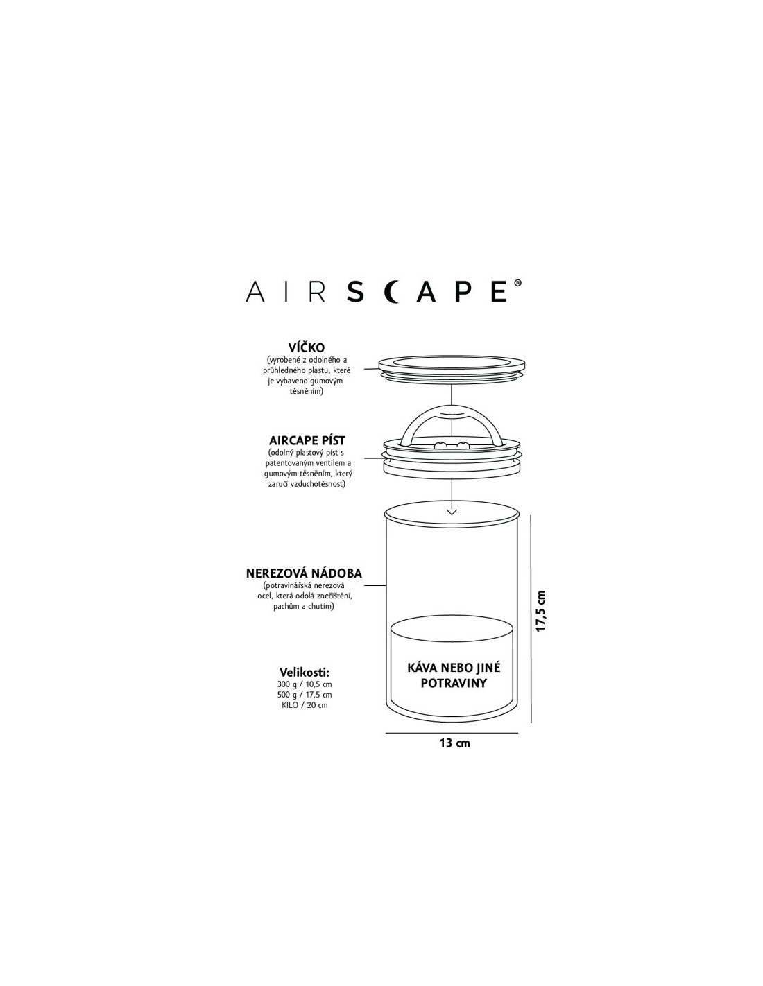 Стоманеният буркан AirScape е подходящ не само за кафе, но и за чай, брашно, ядки, захар, сол или други насипни храни. Препоръчва се ръчно измиване, за да се запази дълготрайността му и херметичността на системата.