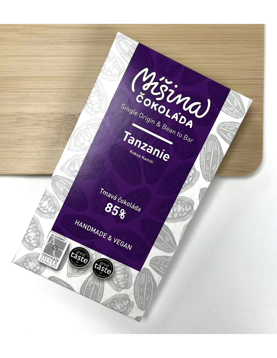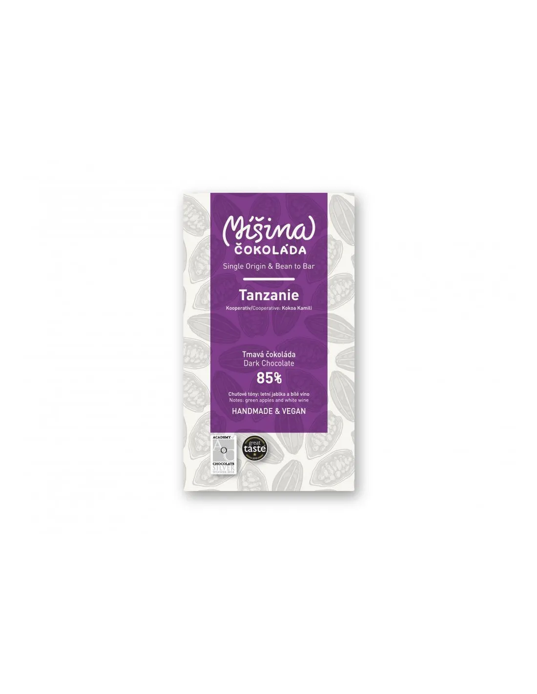Тъмен шоколад 85% с високо съдържание на подбрани органични какаови зърна от Танзания. Гладък до маслен с нотки на ябълки и череши.