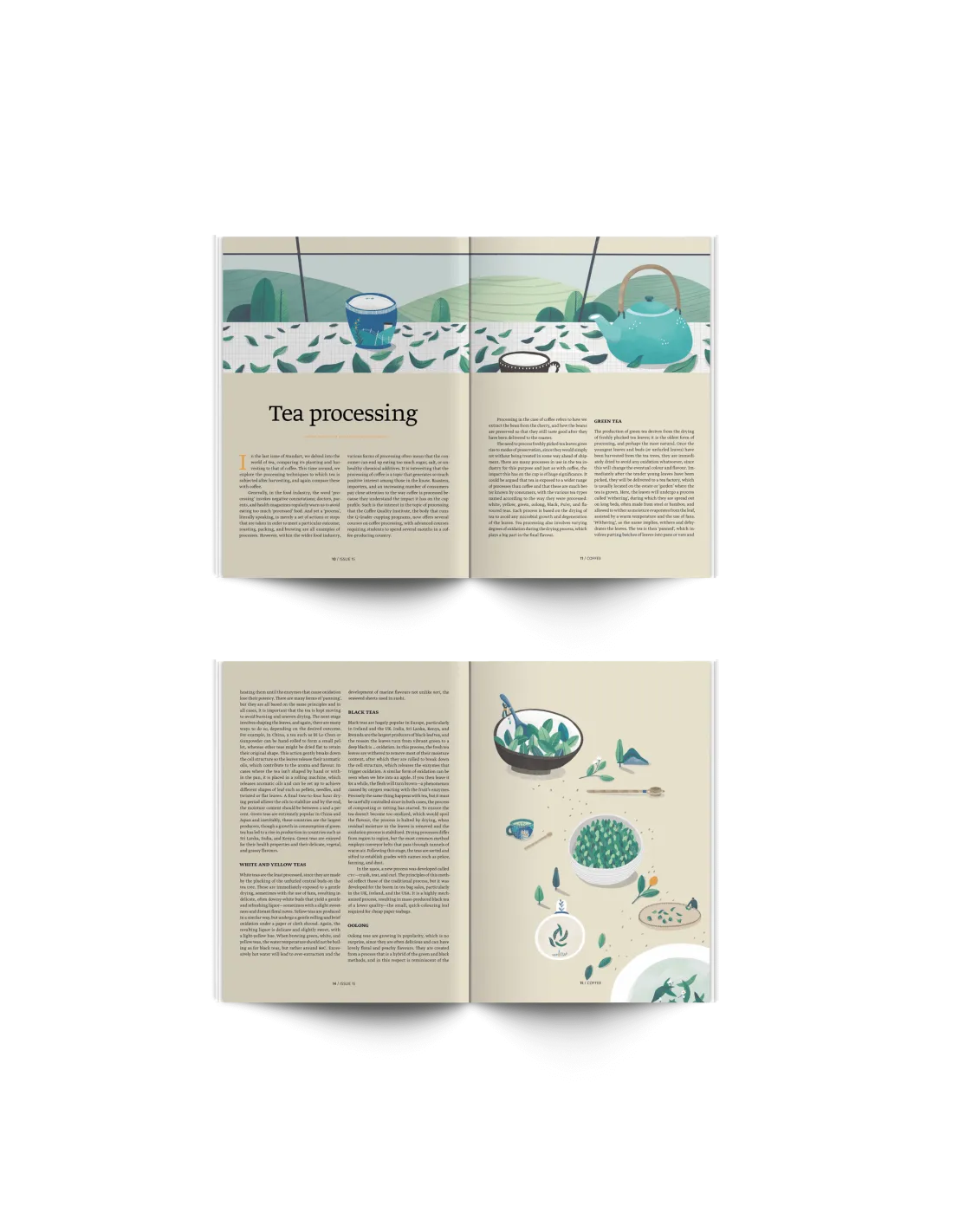 В главата "Кафе " продължаваме поредицата си, в която сравняваме кафето и чая - този път разглеждаме отблизо методите на обработка, последвани от статия за това какво от ритуала на чая може да се приложи към кафето. Оттам се преместваме в далечна Гватемала - страна, съставена от над 300 микроклимата, и разглеждаме как това се отразява на производството на кафе. Завършваме главата с обширно есе за сегашната ценова криза и причините за нея.