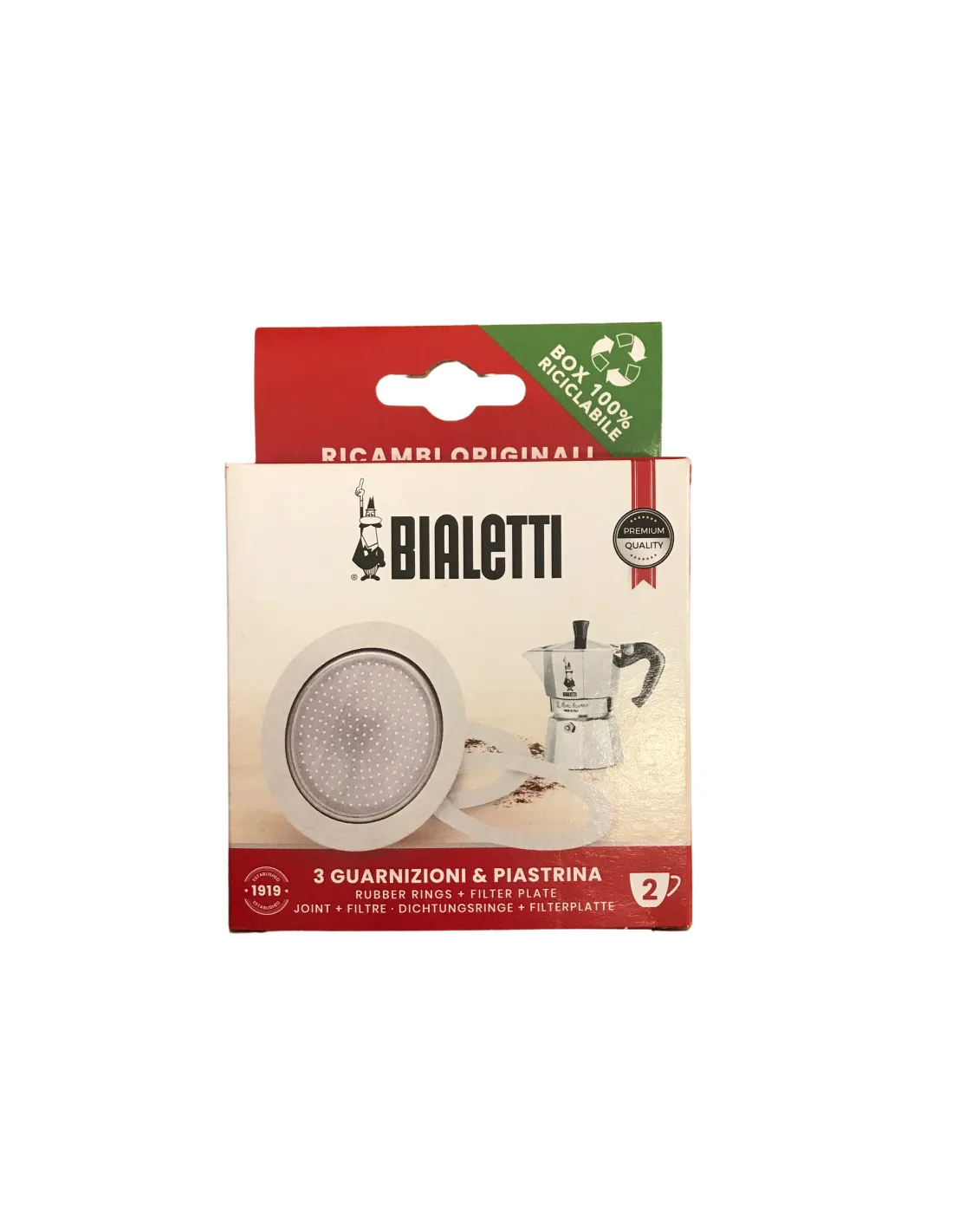 Пакетът съдържа 3x резервни гумени уплътнения за алуминиеви съдове за мока Bialetti с размер на чашата 2 и 1x резервна алуминиева цедка.