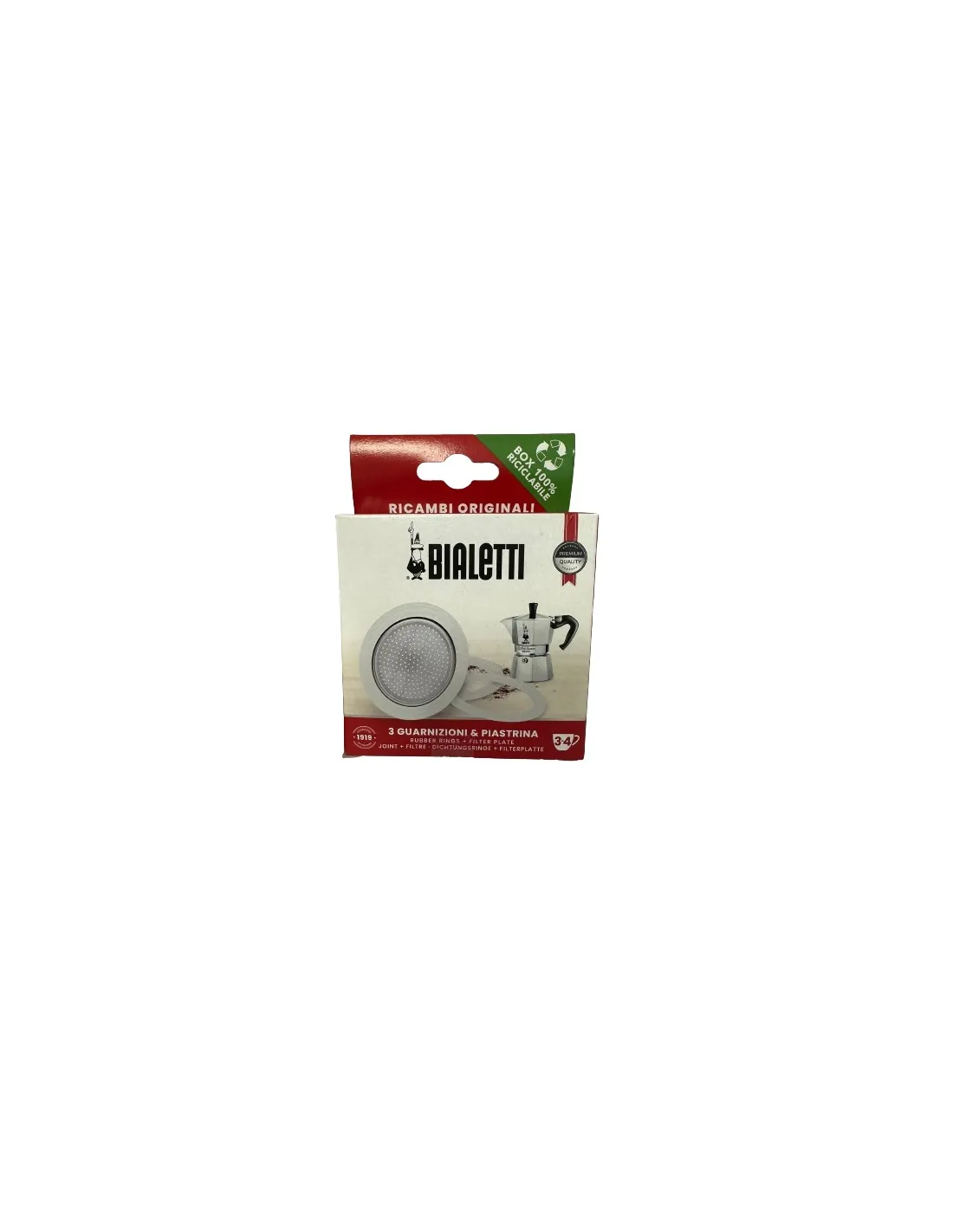 Пакетът съдържа 3x резервни гумени уплътнения за алуминиеви съдове за мока Bialetti с размер на чашата 3 или 4 и 1x резервна алуминиева цедка.