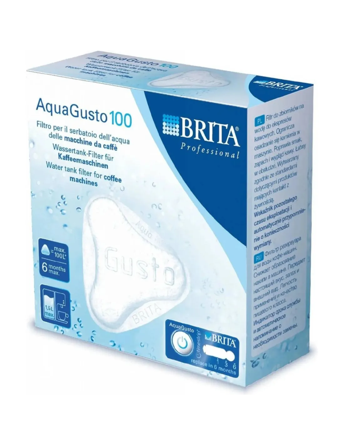 Редовната употреба на филтъра Brita AquaGusto 100 допринася за по-доброто качество на напитките, намалява натрупването на котлен камък и свежда до минимум необходимостта от често отстраняване на котлен камък от машината.